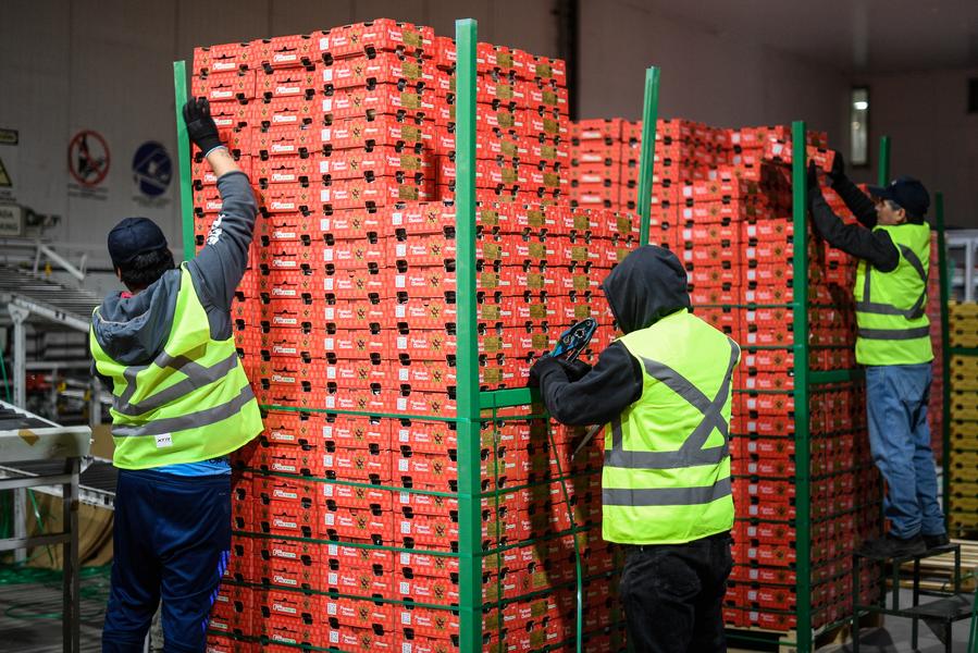 Workers package cherries at a factory in Las Cabras, O'Higgins Region, Chile, Jan. 4, 2024. (Photo by Jorge Villegas/Xinhua)