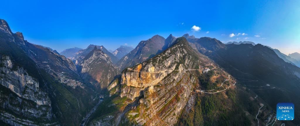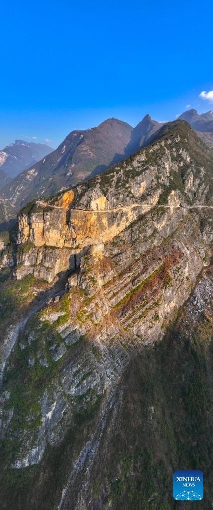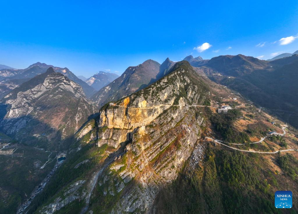 An aerial drone photo taken on Jan. 11, 2024 shows a view of Lanying Cliff Road in Wuxi County, southwest China's Chongqing. (Xinhua/Huang Wei)