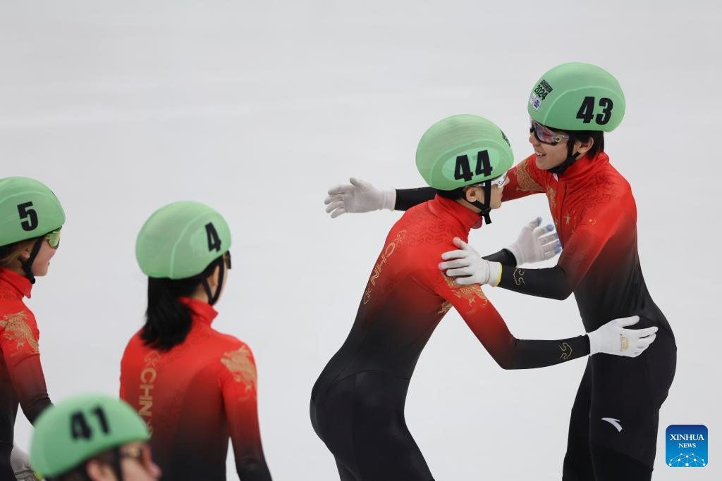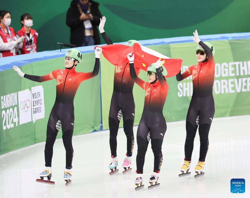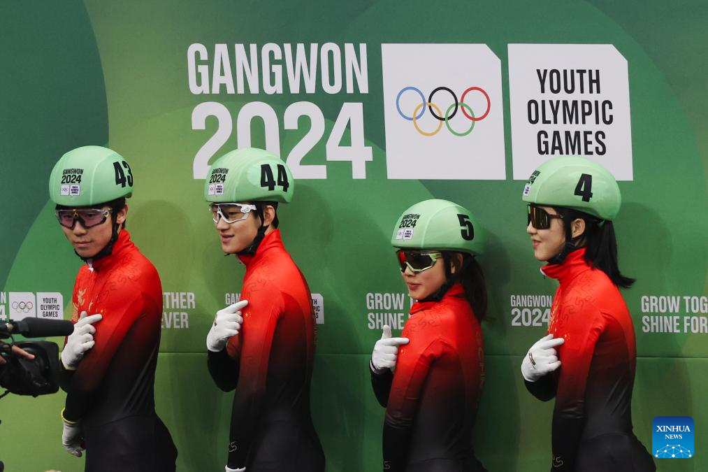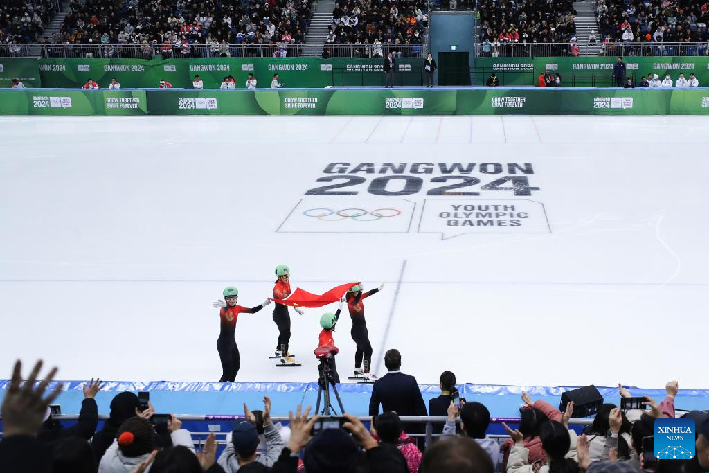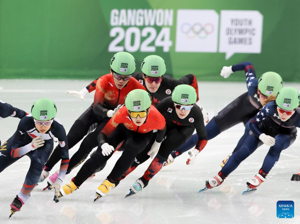 Yang Jingru (C) of team China competes during the mixed team relay final A of short track speed skating event at the Gangwon 2024 Winter Youth Olympic Games in Gangneung, South Korea, Jan. 24, 2024. (Xinhua/Xu Yanan)