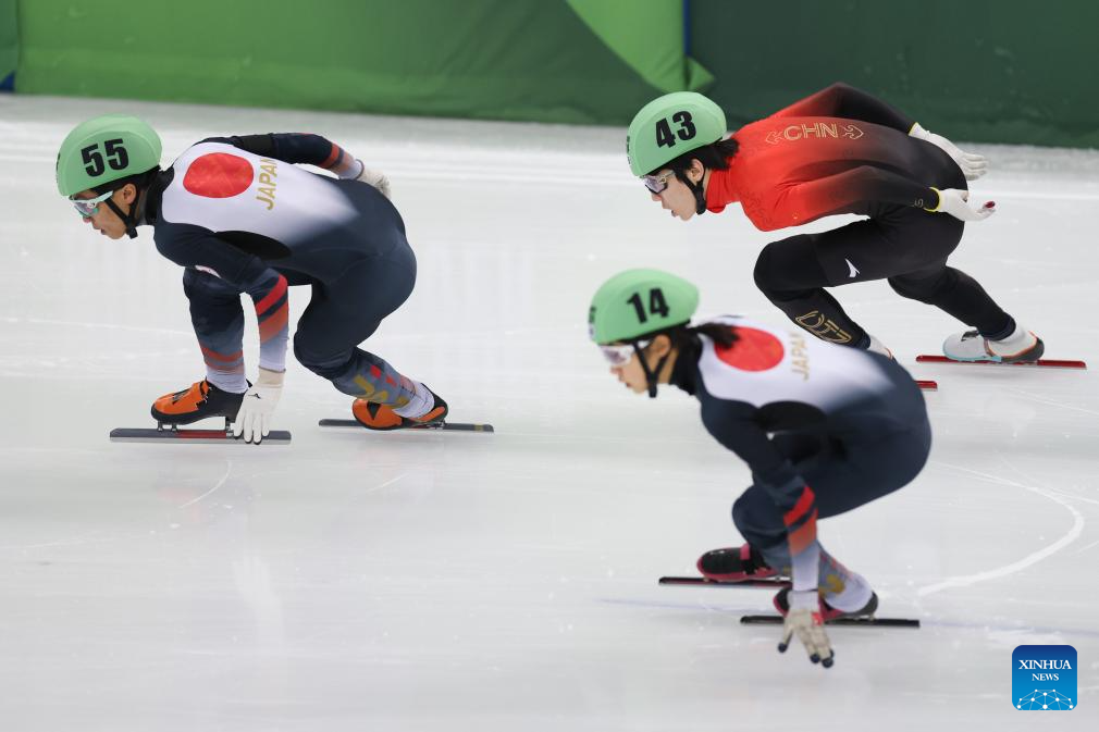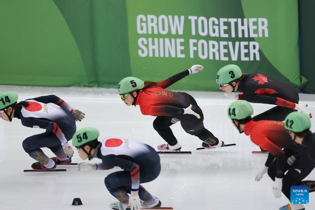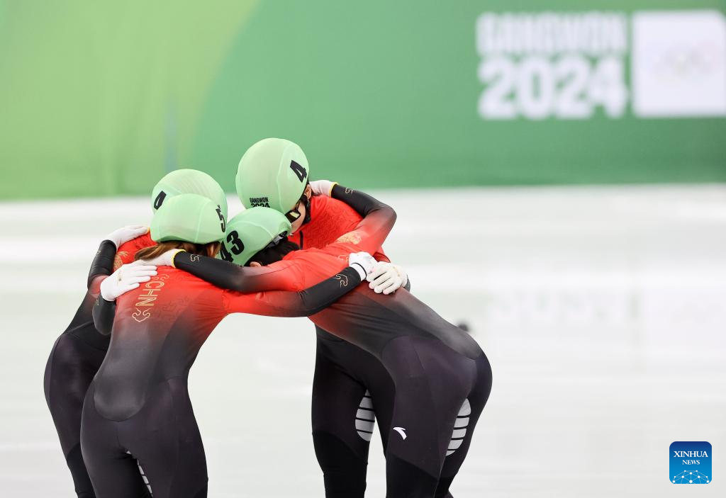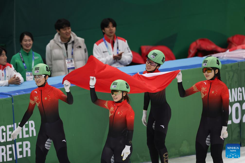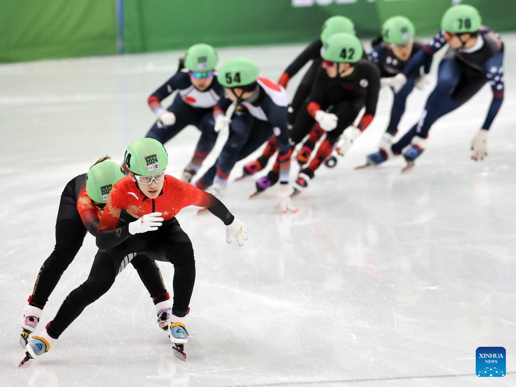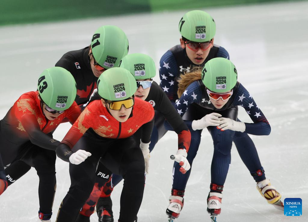 Yang Jingru (C) of team China competes during the mixed team relay final A of short track speed skating event at the Gangwon 2024 Winter Youth Olympic Games in Gangneung, South Korea, Jan. 24, 2024. (Xinhua/Xu Yanan)