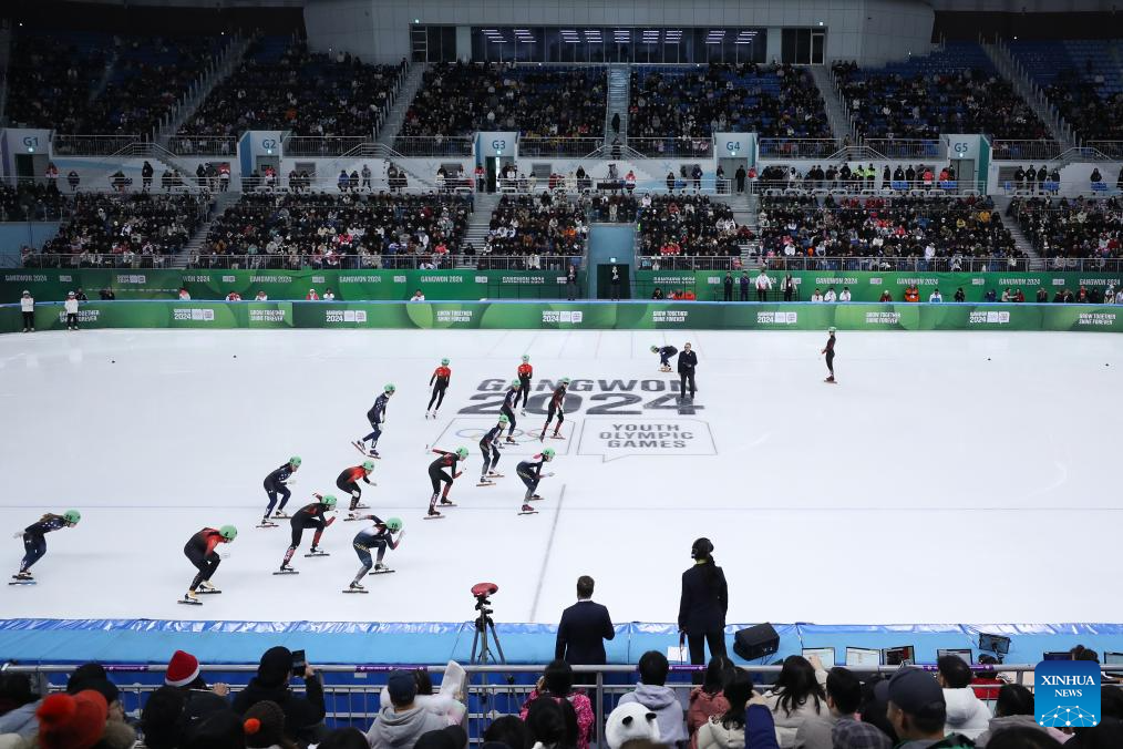 Athletes compete during the mixed team relay final A of short track speed skating event at the Gangwon 2024 Winter Youth Olympic Games in Gangneung, South Korea, Jan. 24, 2024. (Xinhua/Xu Yanan)