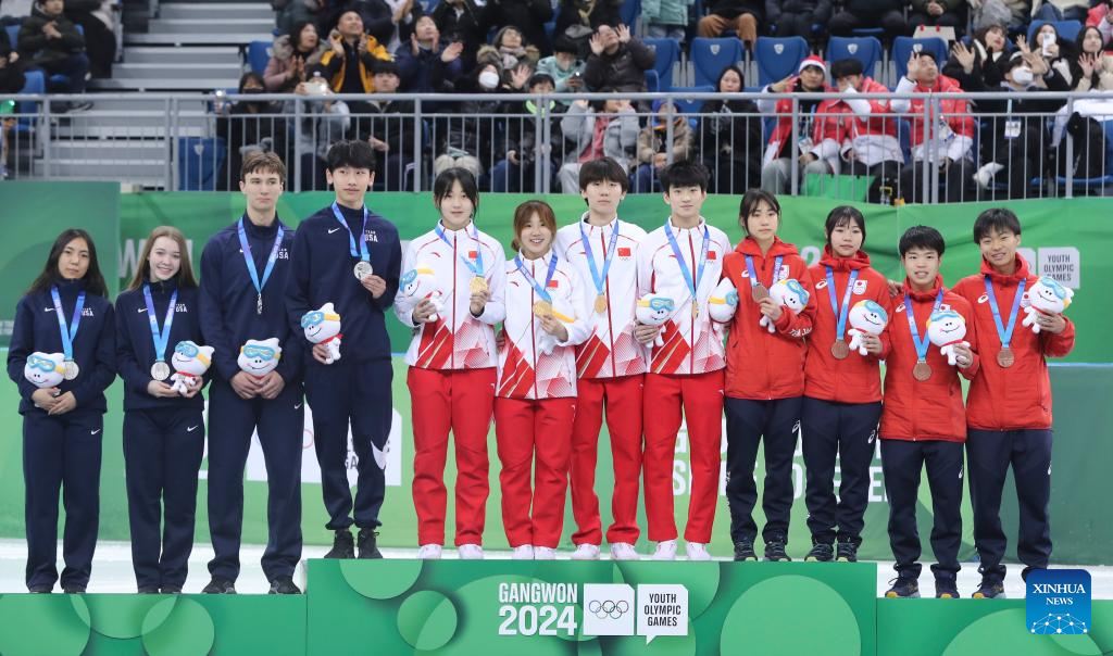 Gold medalists team China (C), silver medalists team the United States (L) and bronze medalists team Japan attend the victory ceremony after the mixed team relay final A of short track speed skating event at the Gangwon 2024 Winter Youth Olympic Games in Gangneung, South Korea, Jan. 24, 2024. (Xinhua/Yao Qilin)