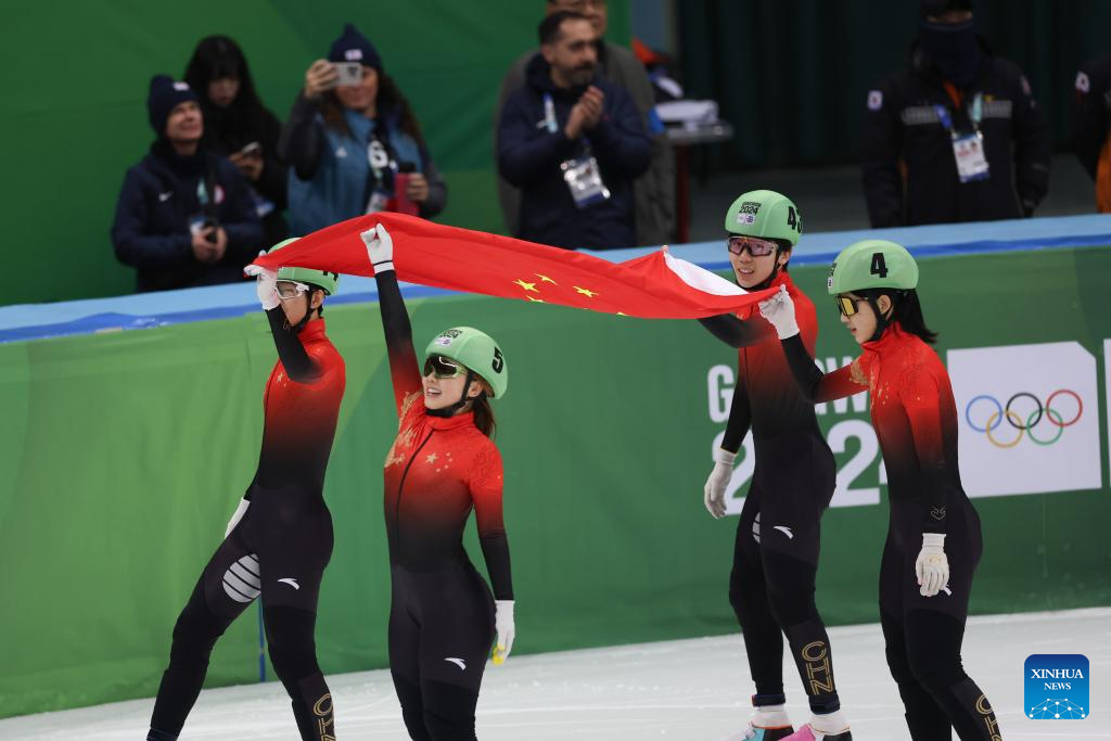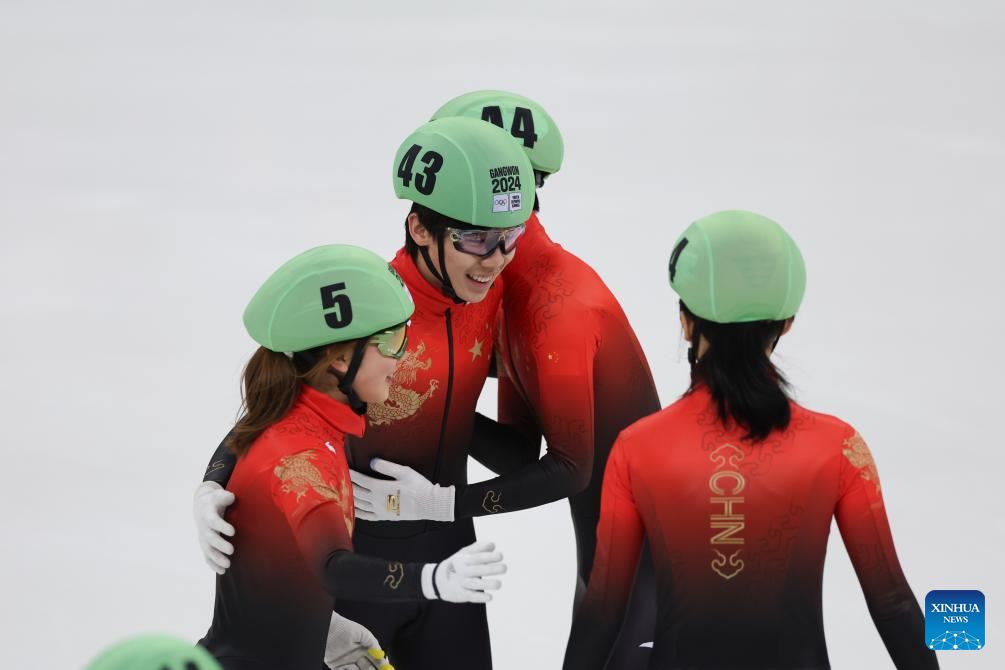 Team China celebrate after winning the mixed team relay final A of short track speed skating event at the Gangwon 2024 Winter Youth Olympic Games in Gangneung, South Korea, Jan. 24, 2024. (Xinhua/Xu Yanan)