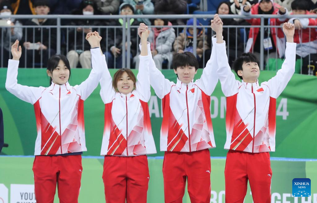 Zhang Xinzhe (2nd L) and Li Jinzi (3rd L) of team China compete during the mixed team relay final A of short track speed skating event at the Gangwon 2024 Winter Youth Olympic Games in Gangneung, South Korea, Jan. 24, 2024. (Xinhua/Yao Qilin)