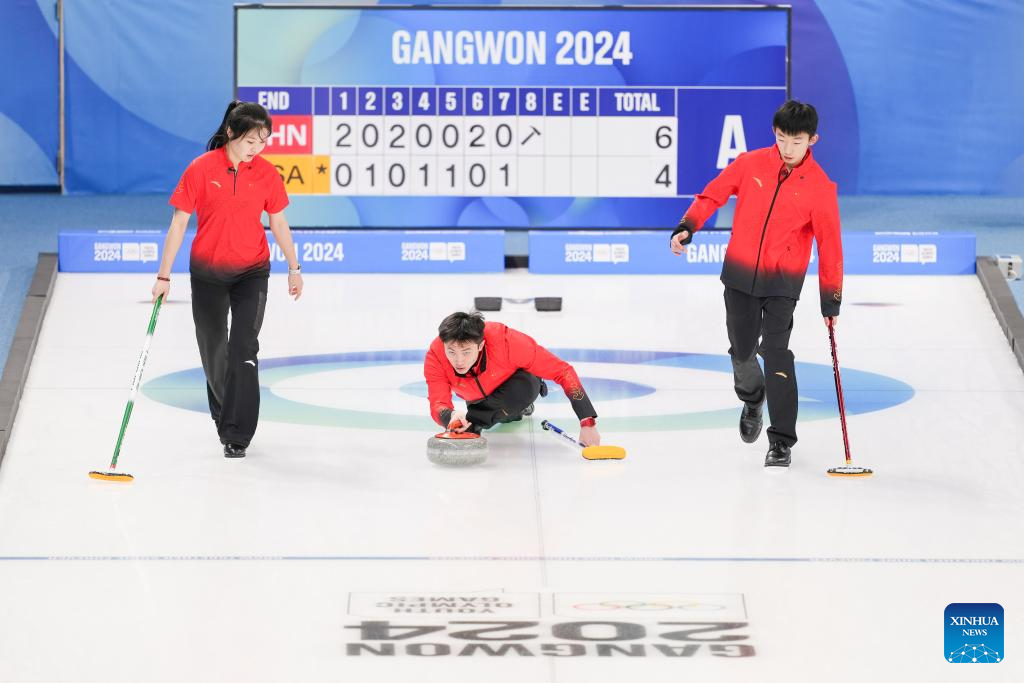 Gao Ya, Li Zetai and Zhang Minghang (L-R) of team China compete during the curling mixed team round robin session 7 group A game between China and the United States at Gangwon 2024 Winter Youth Olympic Games at Gangneung Curling Centre, South Korea, Jan. 24, 2024. (Xinhua/Zhu Wei)