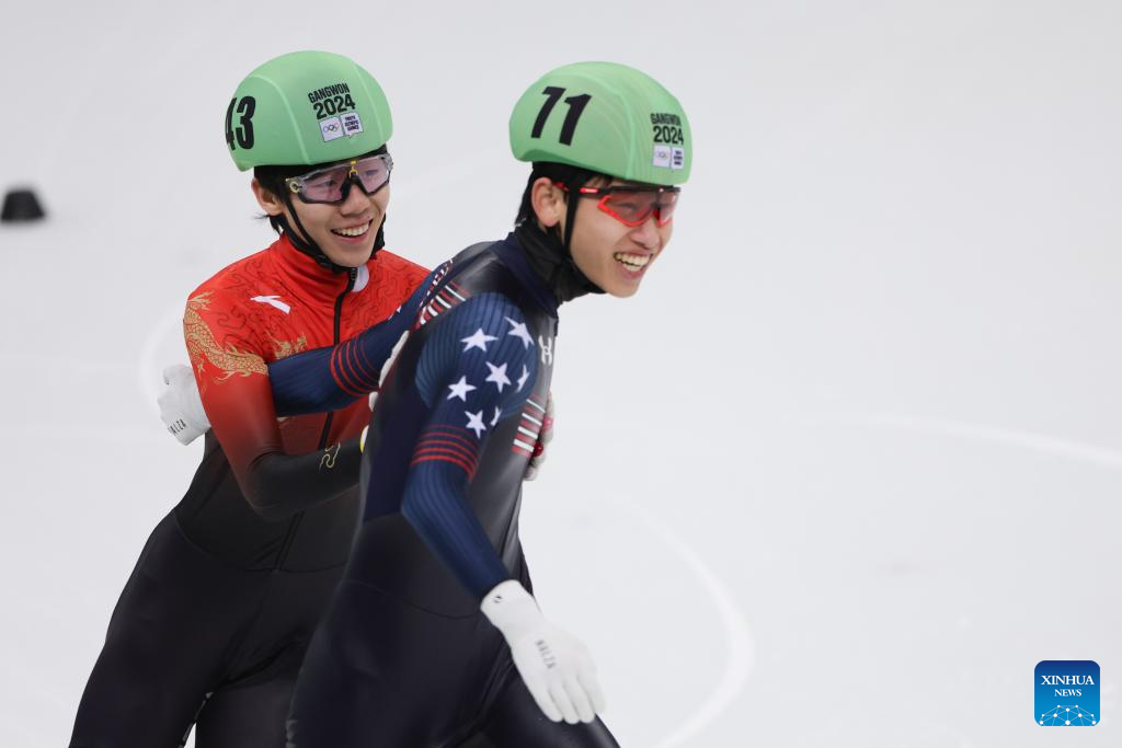 Zhang Bohao (L) of team China and Sean Boxiong Shuai of team USA celebrate after the mixed team relay final A of short track speed skating event at the Gangwon 2024 Winter Youth Olympic Games in Gangneung, South Korea, Jan. 24, 2024. (Xinhua/Xu Yanan)