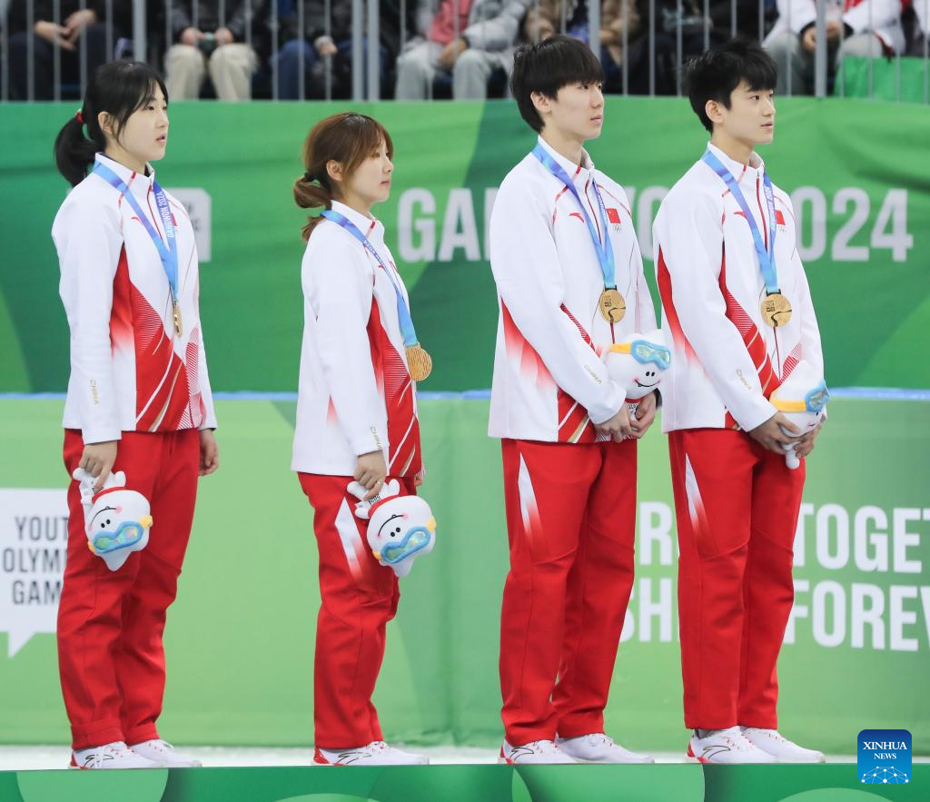 Gold medalists Li Jinzi, Yang Jingru, Zhang Bohao and Zhang Xinzhe (from L to R) of team China attend the victory ceremony for the mixed team relay of short track speed skating event at the Gangwon 2024 Winter Youth Olympic Games in Gangneung, South Korea, Jan. 24, 2024. (Xinhua/Yao Qilin)