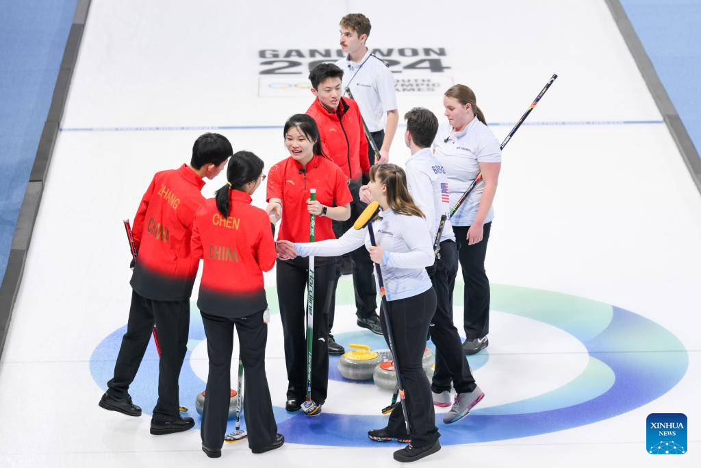 Players of both sides greet each other after the curling mixed team round robin session 7 group A game between China and the United States at Gangwon 2024 Winter Youth Olympic Games at Gangneung Curling Centre, South Korea, Jan. 24, 2024. (Xinhua/Zhu Wei)