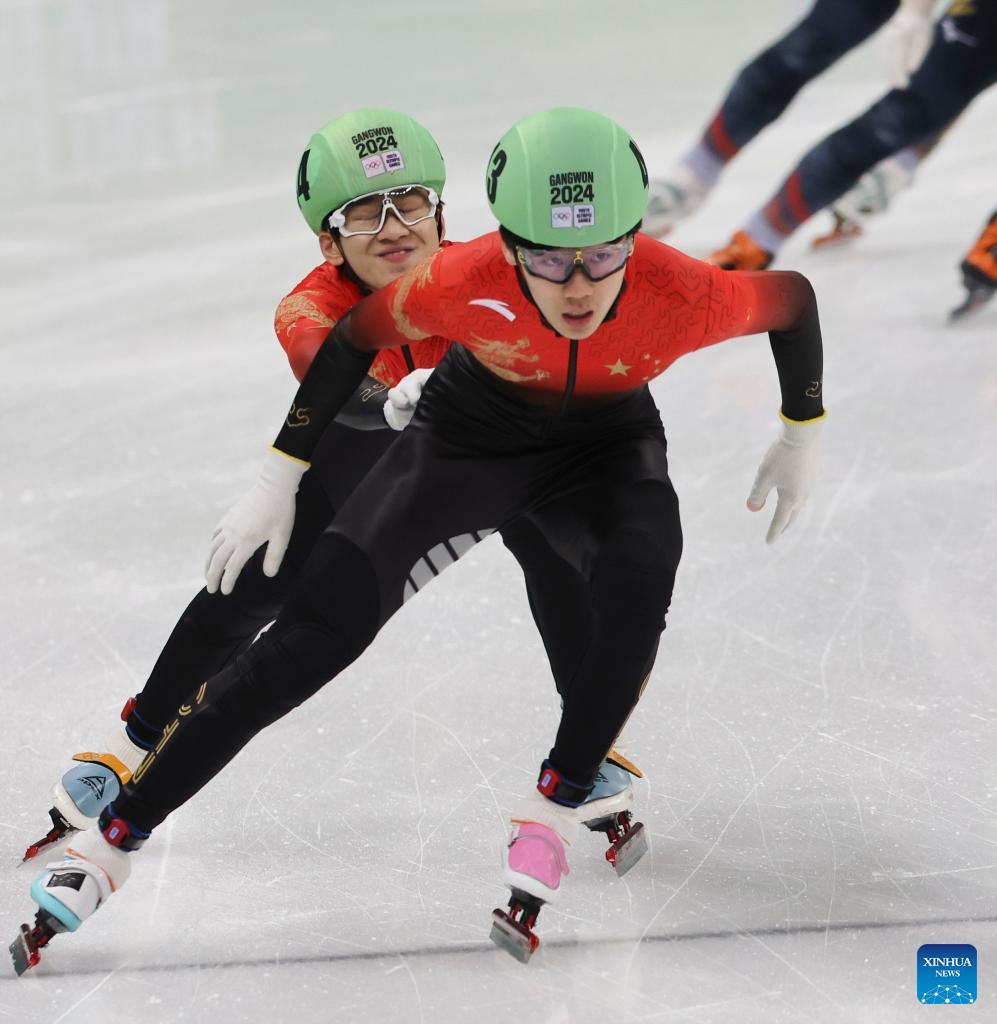 Zhang Bohao (1st L, front) and Li Jinzi (2nd L, front) of team China compete during the mixed team relay final A of short track speed skating event at the Gangwon 2024 Winter Youth Olympic Games in Gangneung, South Korea, Jan. 24, 2024. (Xinhua/Yao Qilin)