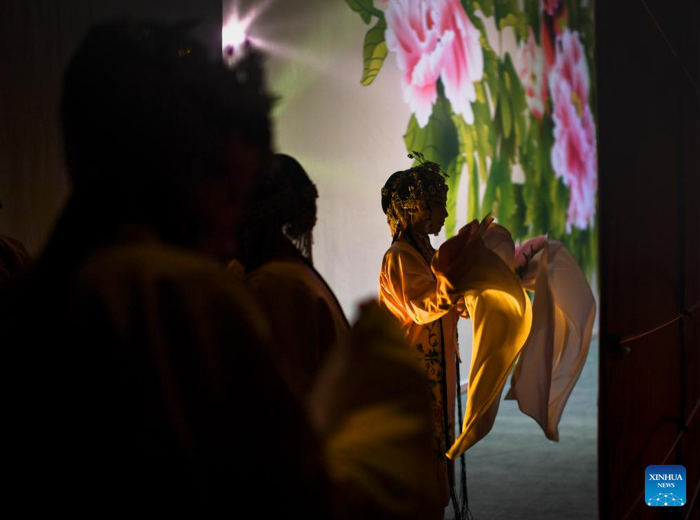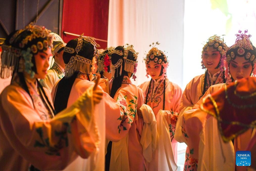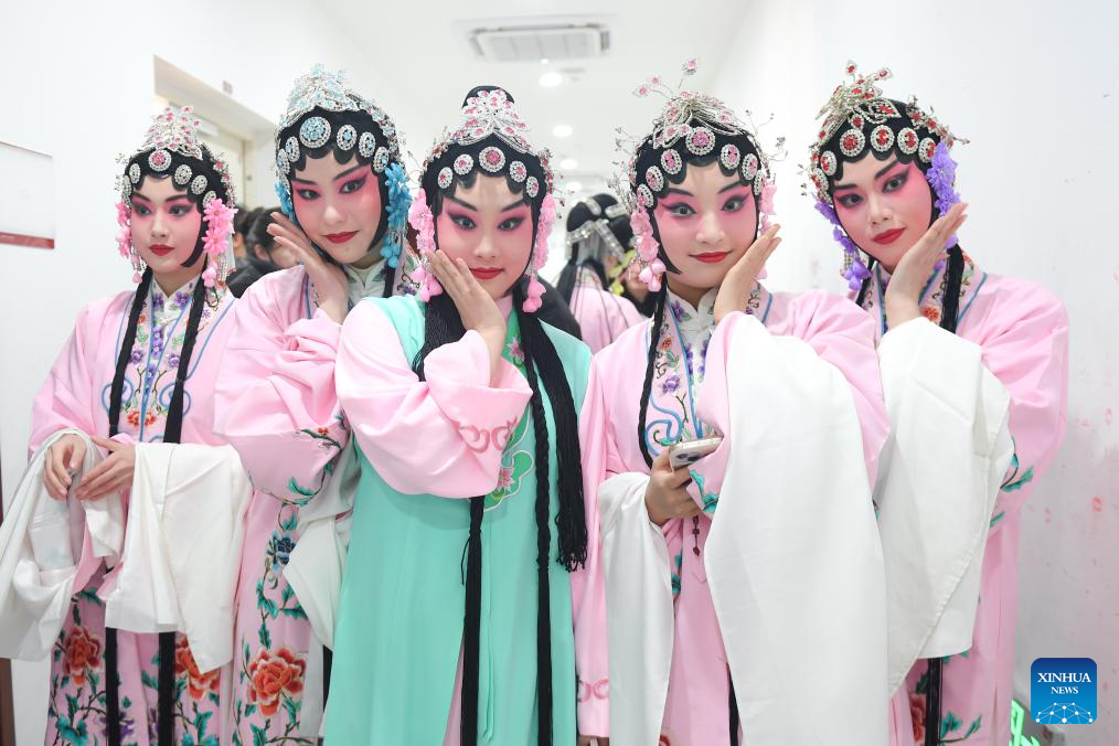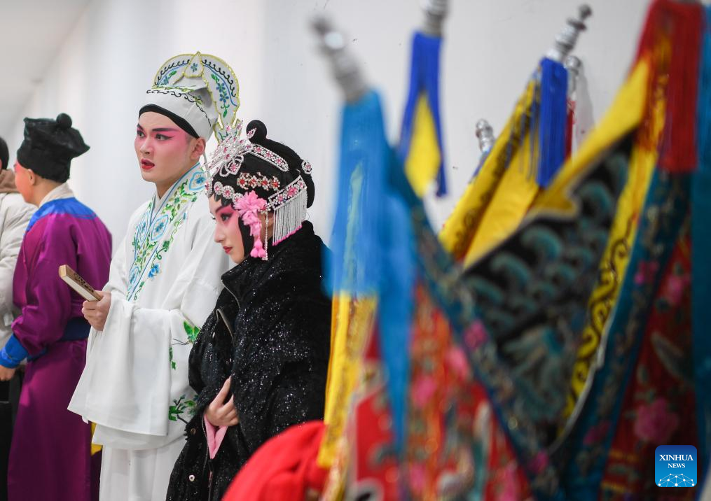 Actresses of Huangmei Opera prepare to go on stage in Wuhan, central China's Hubei Province, Jan. 23, 2024. (Xinhua/Du Zixuan)