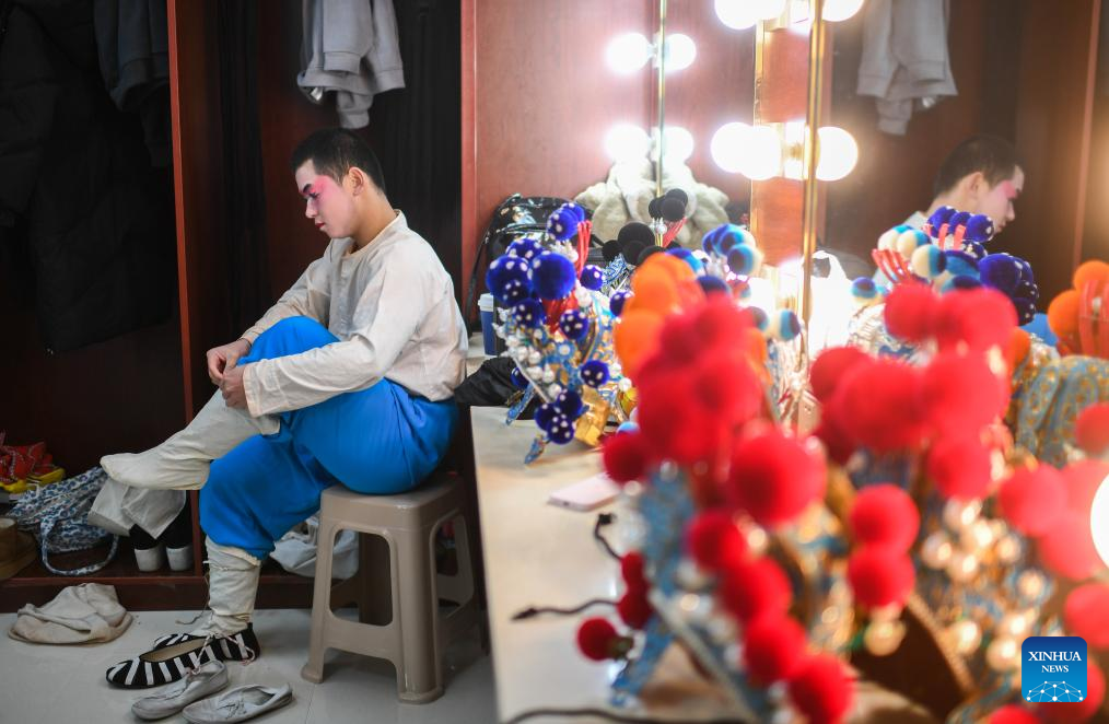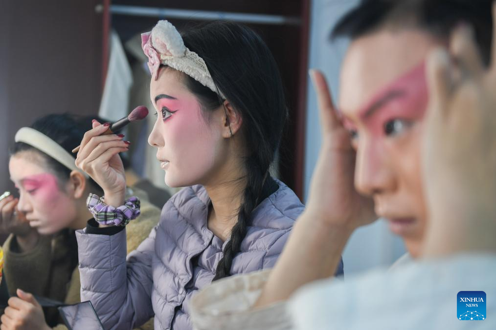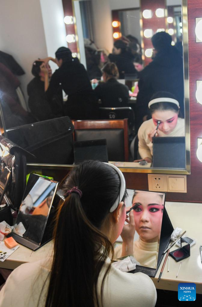 An actor of Hanju Opera prepares before performance in Wuhan, central China's Hubei Province, Jan. 23, 2024. (Xinhua/Du Zixuan)