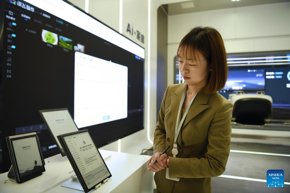 A staff member introduces the iFLYTEK Smart VoiceBook at the iFLYTEK Co. Ltd. in Hefei, east China's Anhui Province, Jan. 19, 2024. (Xinhua/Zhang Duan)