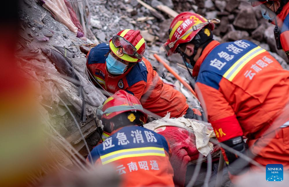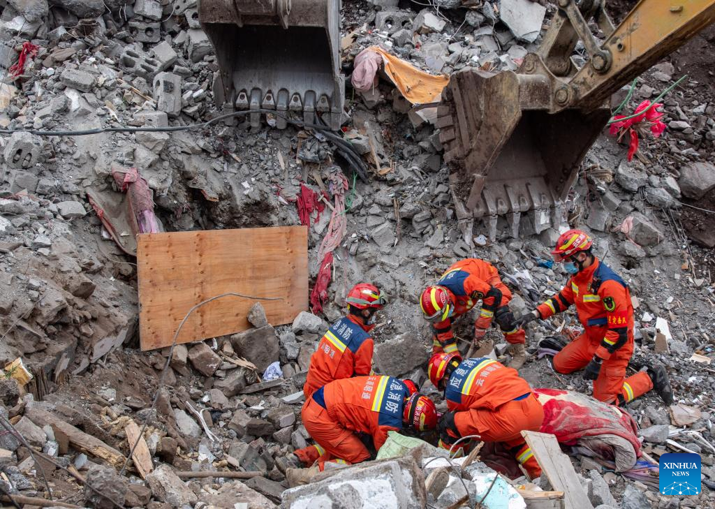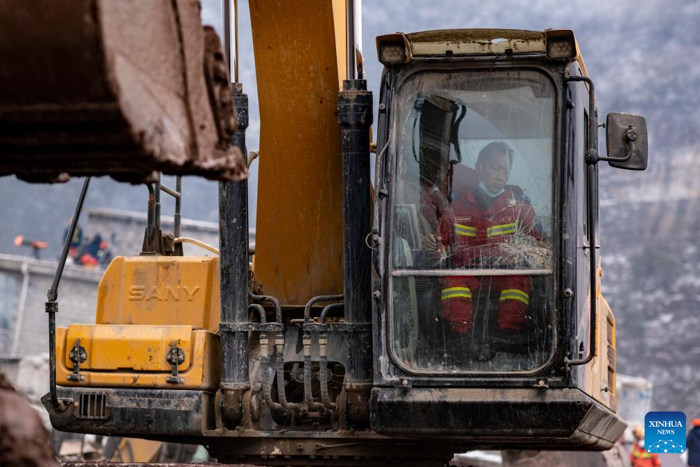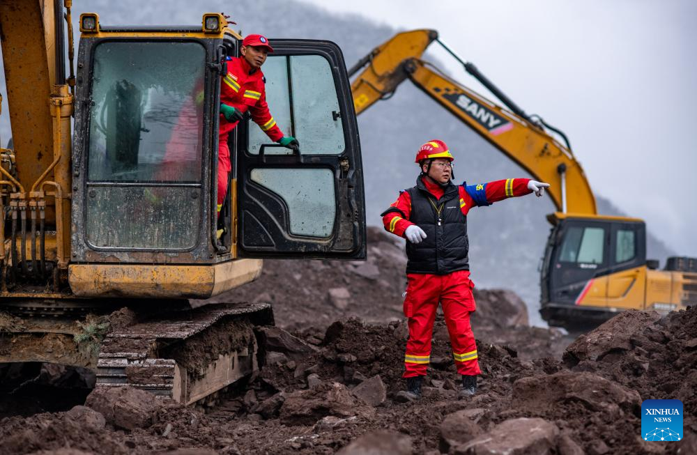Rescuers carry out rescue operations in Liangshui Village, Tangfang Town, Zhenxiong County, southwest China's Yunnan Province, Jan. 24, 2024. The death toll from a landslide that struck a mountainous village in southwest China's Yunnan Province on Monday had climbed to 34 as of 5 p.m. Wednesday, local authorities said. Another 10 people are still missing, according to the local disaster relief headquarters. (Xinhua/Jiang Wenyao)