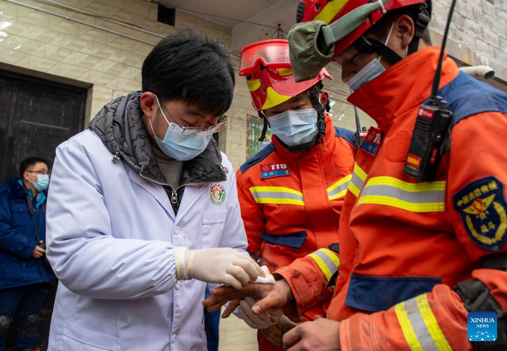 A doctor cleans wound for a rescuer in Liangshui Village, Tangfang Town, Zhenxiong County, southwest China's Yunnan Province, Jan. 24, 2024. The death toll from a landslide that struck a mountainous village in southwest China's Yunnan Province on Monday had climbed to 34 as of 5 p.m. Wednesday, local authorities said. Another 10 people are still missing, according to the local disaster relief headquarters. (Xinhua/Jiang Wenyao)