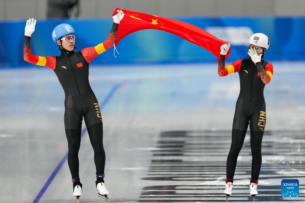 Pan Baoshuo (L) and Liu Yunqi of team China pose during the victory ceremony after the mixed relay final of speed skating event at the Gangwon 2024 Winter Youth Olympic Games in Gangneung, South Korea, Jan. 25, 2024. (Xinhua/Zhu Wei)