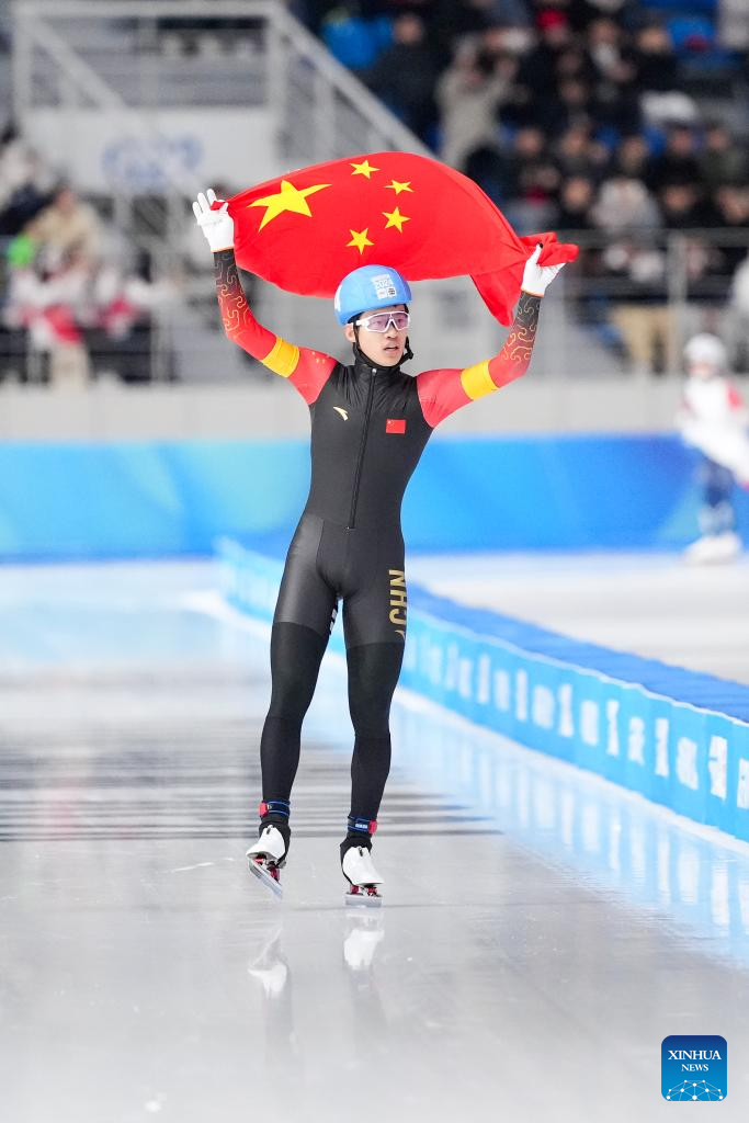Pan Baoshuo of team China celebrates after the mixed relay final of speed skating event at the Gangwon 2024 Winter Youth Olympic Games in Gangneung, South Korea, Jan. 25, 2024. (Xinhua/Zhu Wei)