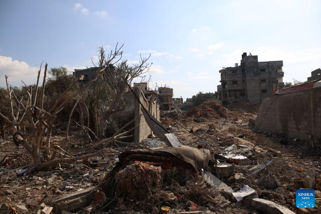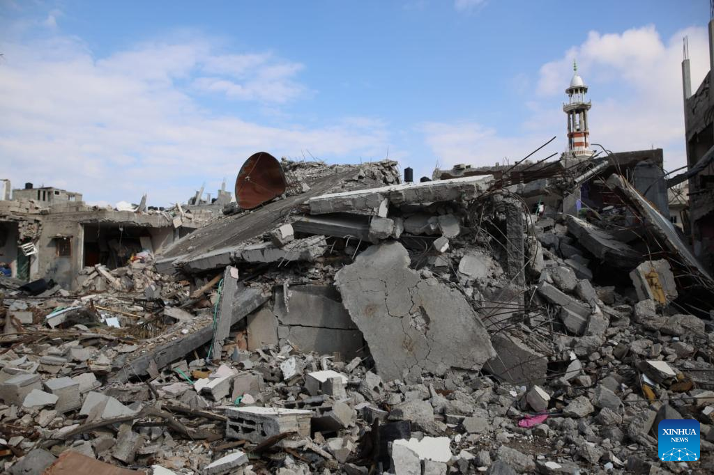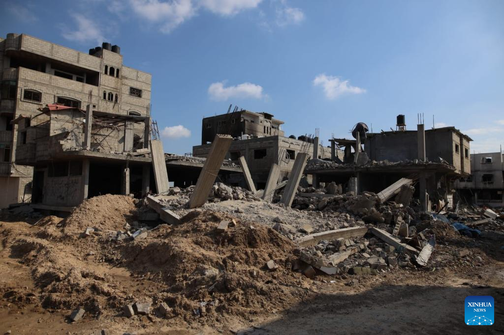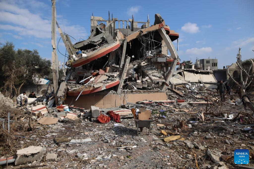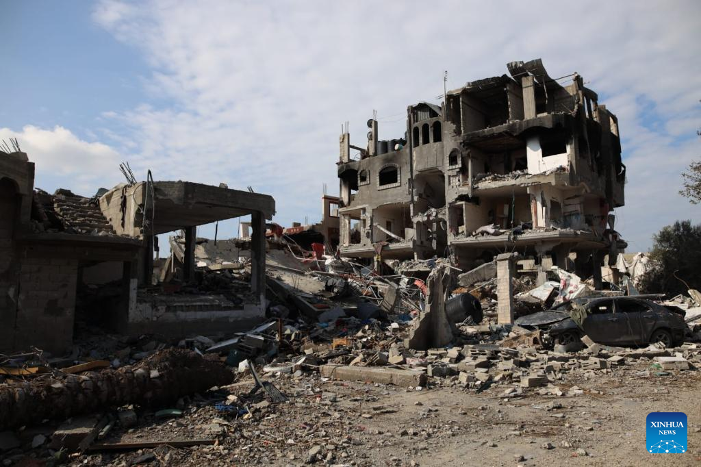 Photo taken on Jan. 25, 2024 shows destroyed buildings at Maghazi refugee camp in central Gaza Strip. The Palestinian death toll from the ongoing Israeli attacks on the Gaza Strip has risen to 25,900 since Oct. 7, 2023, the Hamas-run Health Ministry said on Thursday. (Xinhua)