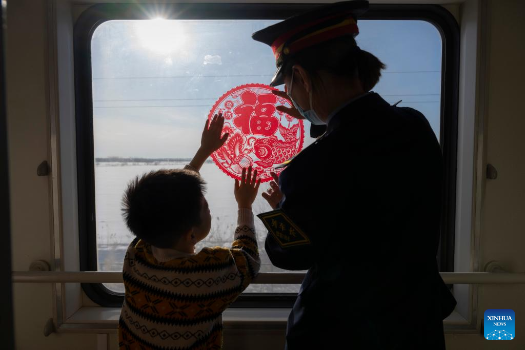 A train attendant and a child paste a paper-cut window decoration on the train K7065 from Harbin to Fuyuan in northeast China's Heilongjiang Province, Jan. 23, 2024. The train K7065/K7066 travels to and fro between the city of Harbin and Fuyuan in China's northeastern province of Heilongjiang. With a single journey time of nearly 15 hours, the train replaced old carriages with new ones having air conditioning system, offering a better travel experience for locals who visit friends or commute to work or study along the line. (Xinhua/Cai Yang)