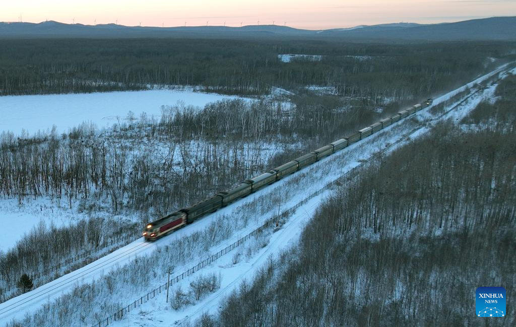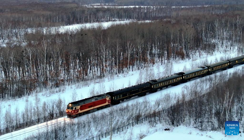 A screenshot taken from an aerial video shows the train K7066 running along the railway from Fuyuan to Harbin in northeast China's Heilongjiang Province, Jan. 23, 2024. The train K7065/K7066 travels to and fro between the city of Harbin and Fuyuan in China's northeastern province of Heilongjiang. With a single journey time of nearly 15 hours, the train replaced old carriages with new ones having air conditioning system, offering a better travel experience for locals who visit friends or commute to work or study along the line. (Xinhua/Cai Yang)