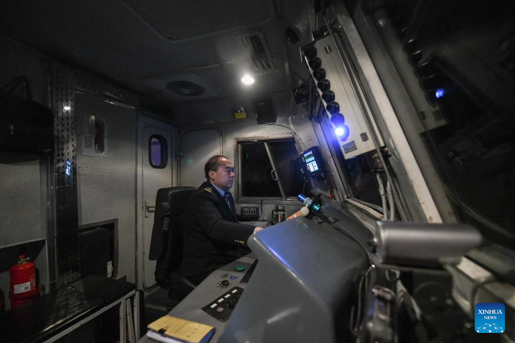 Driver Qiao Shuhai works at the cab of the train K7065 from Harbin to Fuyuan in northeast China's Heilongjiang Province, Jan. 23, 2024. The train K7065/K7066 travels to and fro between the city of Harbin and Fuyuan in China's northeastern province of Heilongjiang. With a single journey time of nearly 15 hours, the train replaced old carriages with new ones having air conditioning system, offering a better travel experience for locals who visit friends or commute to work or study along the line. (Xinhua/Wang Song)