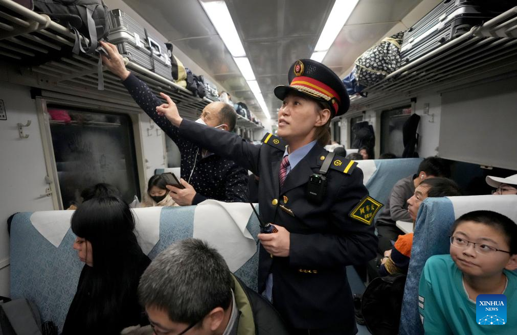 Train conductor Xu Dan conducts inspection work on the train K7065 from Harbin to Fuyuan in northeast China's Heilongjiang Province, Jan. 22, 2024. The train K7065/K7066 travels to and fro between the city of Harbin and Fuyuan in China's northeastern province of Heilongjiang. With a single journey time of nearly 15 hours, the train replaced old carriages with new ones having air conditioning system, offering a better travel experience for locals who visit friends or commute to work or study along the line. (Xinhua/Wang Yuguo)