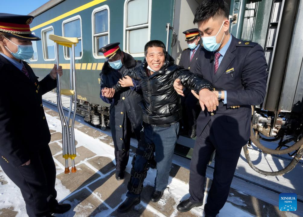 Train attendants help a man get off a train in Honghe railway station in Jiamusi, northeast China's Heilongjiang Province, Jan. 23, 2024. The train K7065/K7066 travels to and fro between the city of Harbin and Fuyuan in China's northeastern province of Heilongjiang. With a single journey time of nearly 15 hours, the train replaced old carriages with new ones having air conditioning system, offering a better travel experience for locals who visit friends or commute to work or study along the line. (Xinhua/Wang Yuguo)