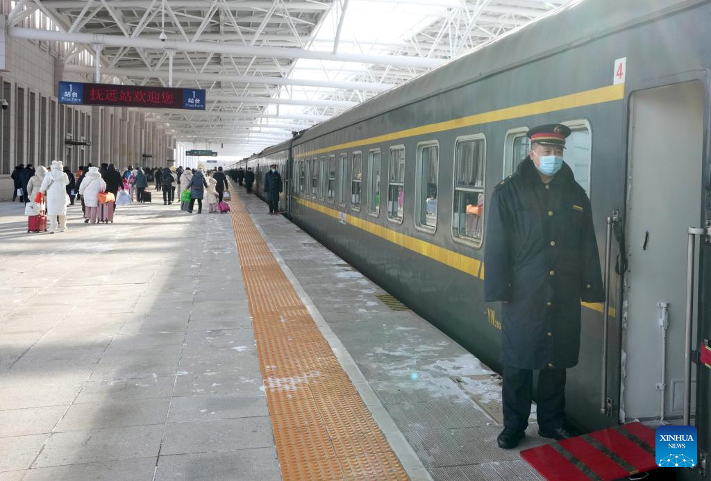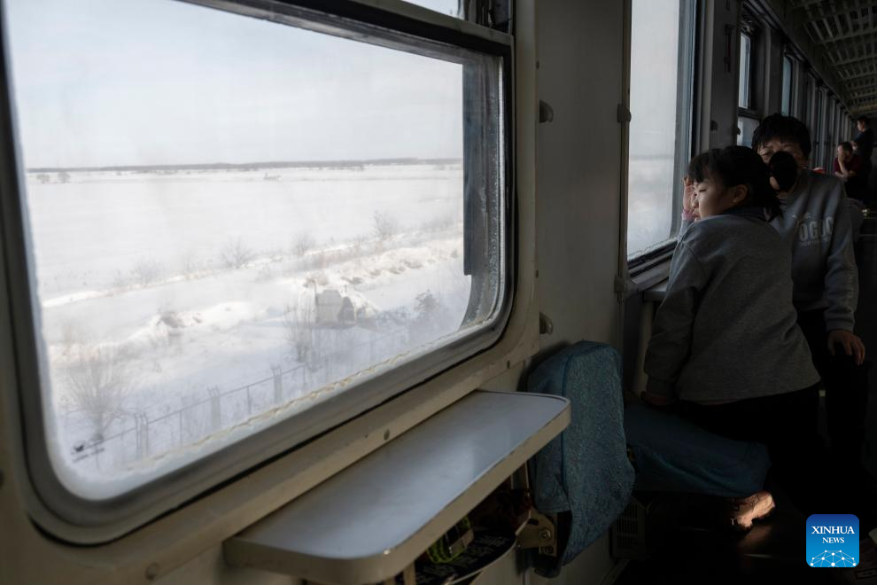 Passengers ride the train K7065 from Harbin to Fuyuan in northeast China's Heilongjiang Province, Jan. 23, 2024. The train K7065/K7066 travels to and fro between the city of Harbin and Fuyuan in China's northeastern province of Heilongjiang. With a single journey time of nearly 15 hours, the train replaced old carriages with new ones having air conditioning system, offering a better travel experience for locals who visit friends or commute to work or study along the line. (Xinhua/Cai Yang)