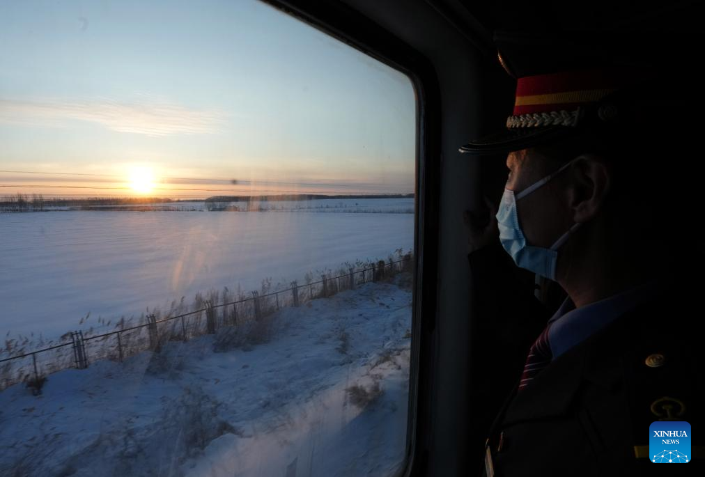 A train attendant watches the sunrise after working overnight on the train K7065 from Harbin to Fuyuan in northeast China's Heilongjiang Province, Jan. 23, 2024. The train K7065/K7066 travels to and fro between the city of Harbin and Fuyuan in China's northeastern province of Heilongjiang. With a single journey time of nearly 15 hours, the train replaced old carriages with new ones having air conditioning system, offering a better travel experience for locals who visit friends or commute to work or study along the line. (Xinhua/Wang Yuguo)