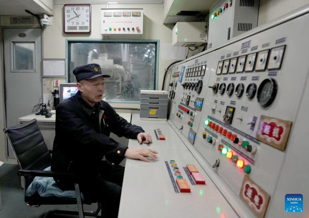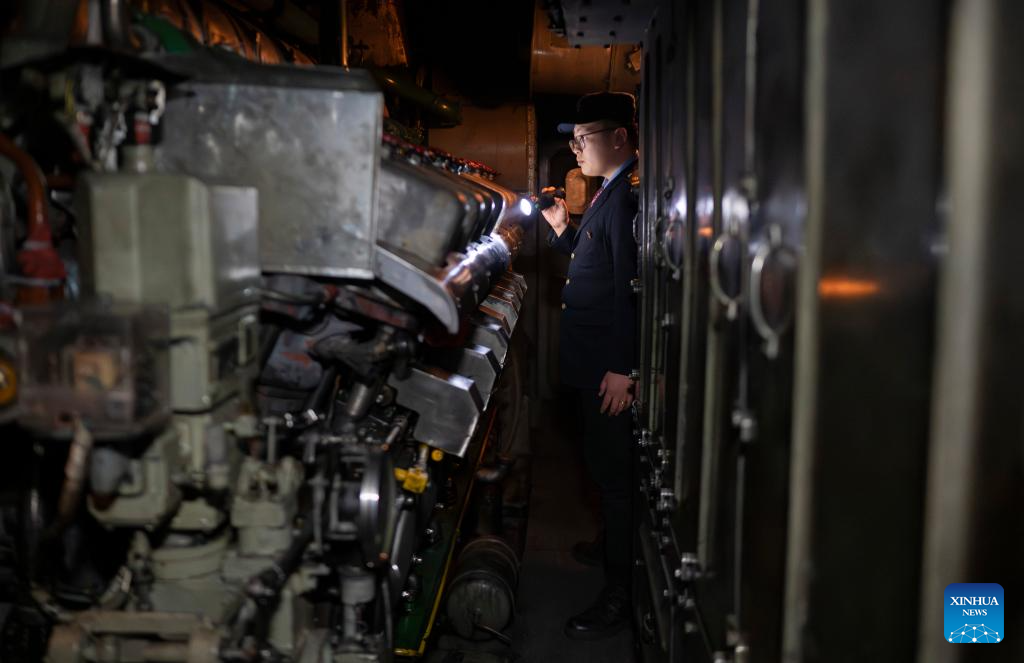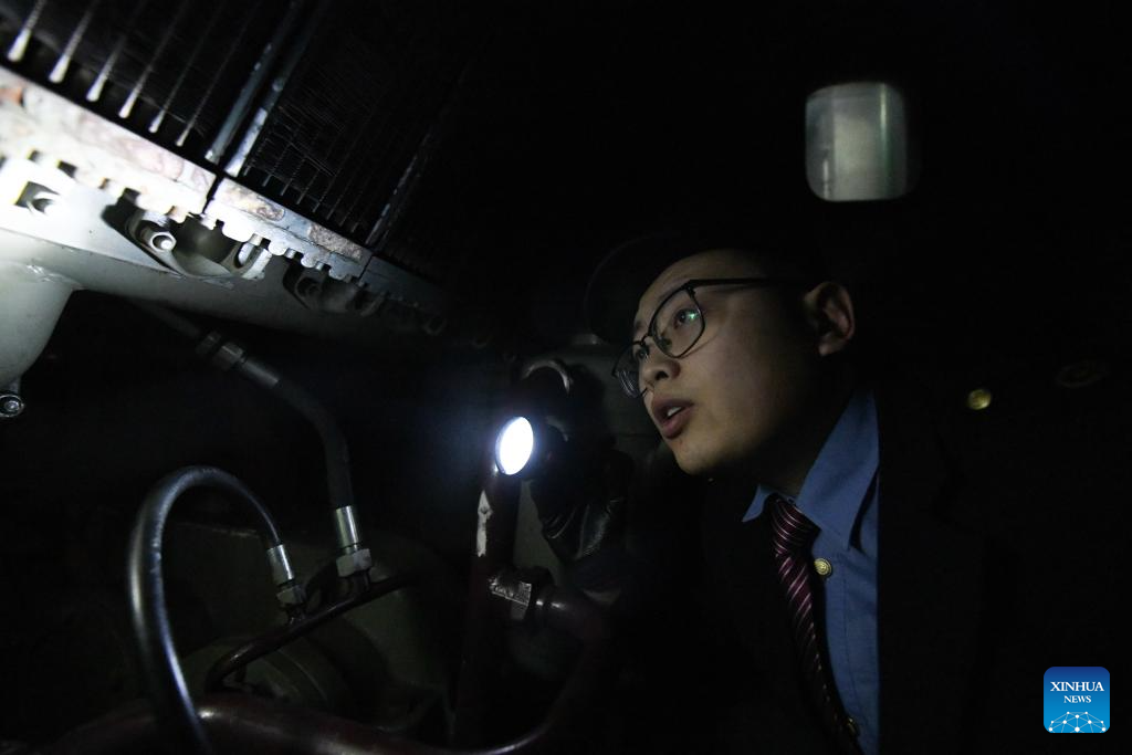 Driver Xu Ruinan works at the mechanical room of the train K7065 from Harbin to Fuyuan in northeast China's Heilongjiang Province, Jan. 23, 2024. The train K7065/K7066 travels to and fro between the city of Harbin and Fuyuan in China's northeastern province of Heilongjiang. With a single journey time of nearly 15 hours, the train replaced old carriages with new ones having air conditioning system, offering a better travel experience for locals who visit friends or commute to work or study along the line. (Xinhua)