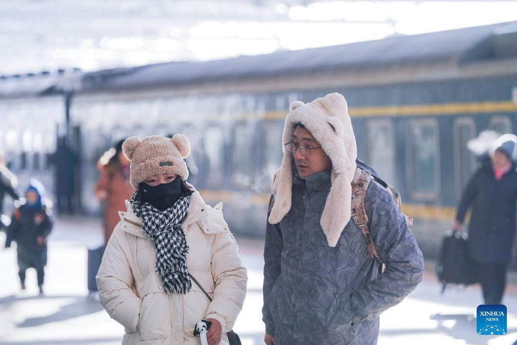 Passengers get off the train K7065 from Harbin to Fuyuan after arriving in Fuyuan, northeast China's Heilongjiang Province, Jan. 23, 2024. The train K7065/K7066 travels to and fro between the city of Harbin and Fuyuan in China's northeastern province of Heilongjiang. With a single journey time of nearly 15 hours, the train replaced old carriages with new ones having air conditioning system, offering a better travel experience for locals who visit friends or commute to work or study along the line. (Xinhua/Wang Song)