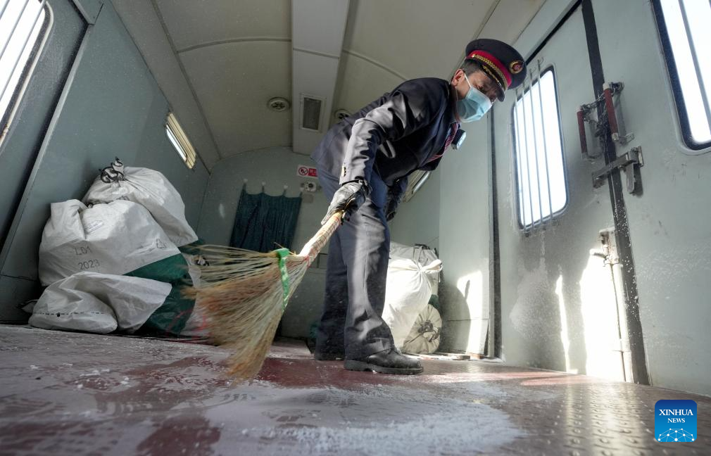 Train attendant Zhao Mingjun conducts cleaning work on the train K7065 from Harbin to Fuyuan in northeast China's Heilongjiang Province, Jan. 23, 2024. The train K7065/K7066 travels to and fro between the city of Harbin and Fuyuan in China's northeastern province of Heilongjiang. With a single journey time of nearly 15 hours, the train replaced old carriages with new ones having air conditioning system, offering a better travel experience for locals who visit friends or commute to work or study along the line. (Xinhua/Wang Yuguo)