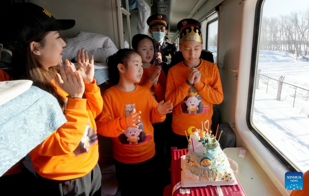 A student celebrates his birthday on the train K7065 from Harbin to Fuyuan in northeast China's Heilongjiang Province, Jan. 23, 2024. The train K7065/K7066 travels to and fro between the city of Harbin and Fuyuan in China's northeastern province of Heilongjiang. With a single journey time of nearly 15 hours, the train replaced old carriages with new ones having air conditioning system, offering a better travel experience for locals who visit friends or commute to work or study along the line. (Xinhua/Wang Yuguo)