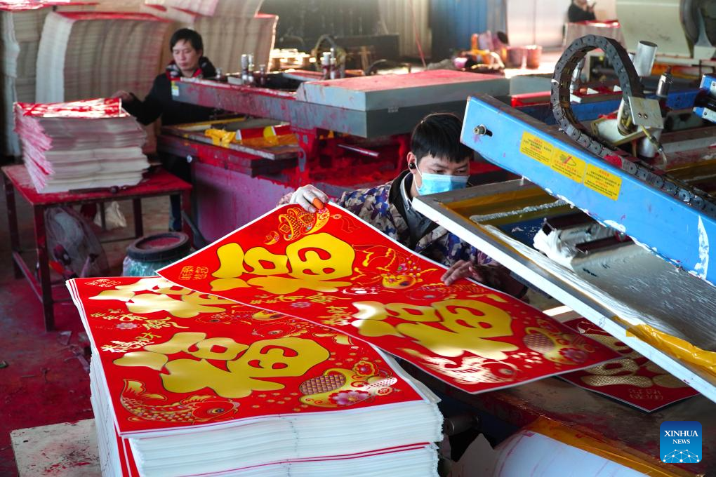 Workers produce Spring Festival posters in Donglijia Village of Gaomi City, east China's Shandong Province, on Jan. 24, 2024. As the Spring Festival is approaching, workers have been busy producing Spring Festival couplets and posters with good blessings for the upcoming lunar new year in Gaomi, a major producing base in Shandong Province. The Spring Festival couplets and posters producing industry here yields almost 8000 tonnes annually with an output value of nearly 100 million yuan (13.9 million U.S. dollars). It has become a characteristic industry increasing villagers' income. (Xinhua/Xu Suhui)