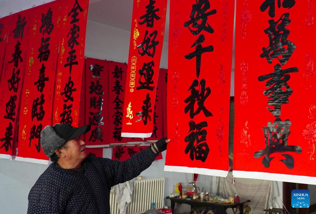 A worker introduces Spring Festival couplets in Donglijia Village of Gaomi City, east China's Shandong Province, on Jan. 23, 2024. As the Spring Festival is approaching, workers have been busy producing Spring Festival couplets and posters with good blessings for the upcoming lunar new year in Gaomi, a major producing base in Shandong Province. The Spring Festival couplets and posters producing industry here yields almost 8000 tonnes annually with an output value of nearly 100 million yuan (13.9 million U.S. dollars). It has become a characteristic industry increasing villagers' income. (Xinhua/Xu Suhui)