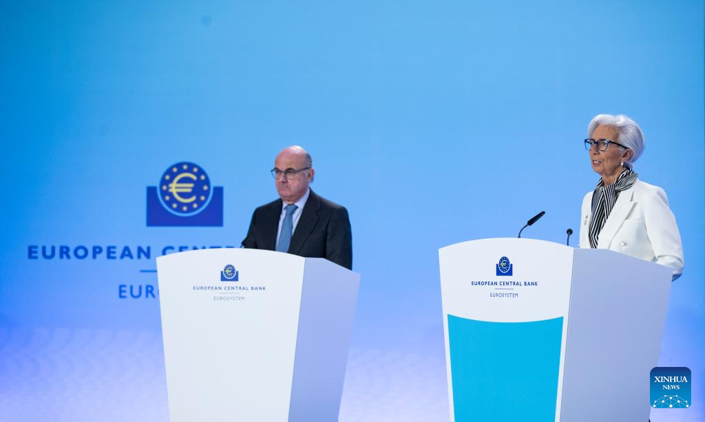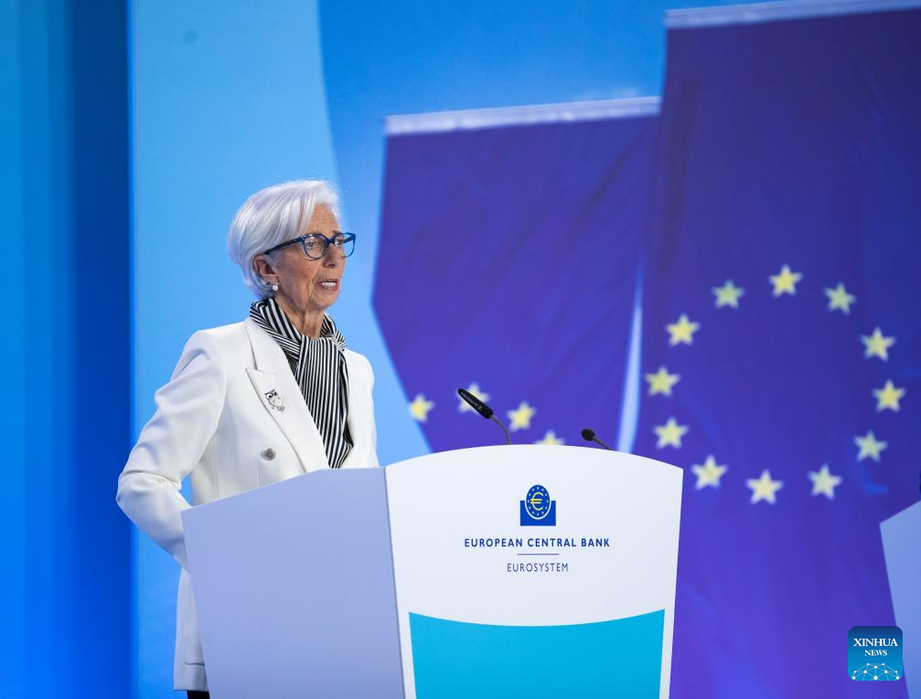 European Central Bank (ECB) President Christine Lagarde (R) speaks during a press conference in Frankfurt, Germany, Jan. 25, 2024. (Xinhua/Zhang Fan)