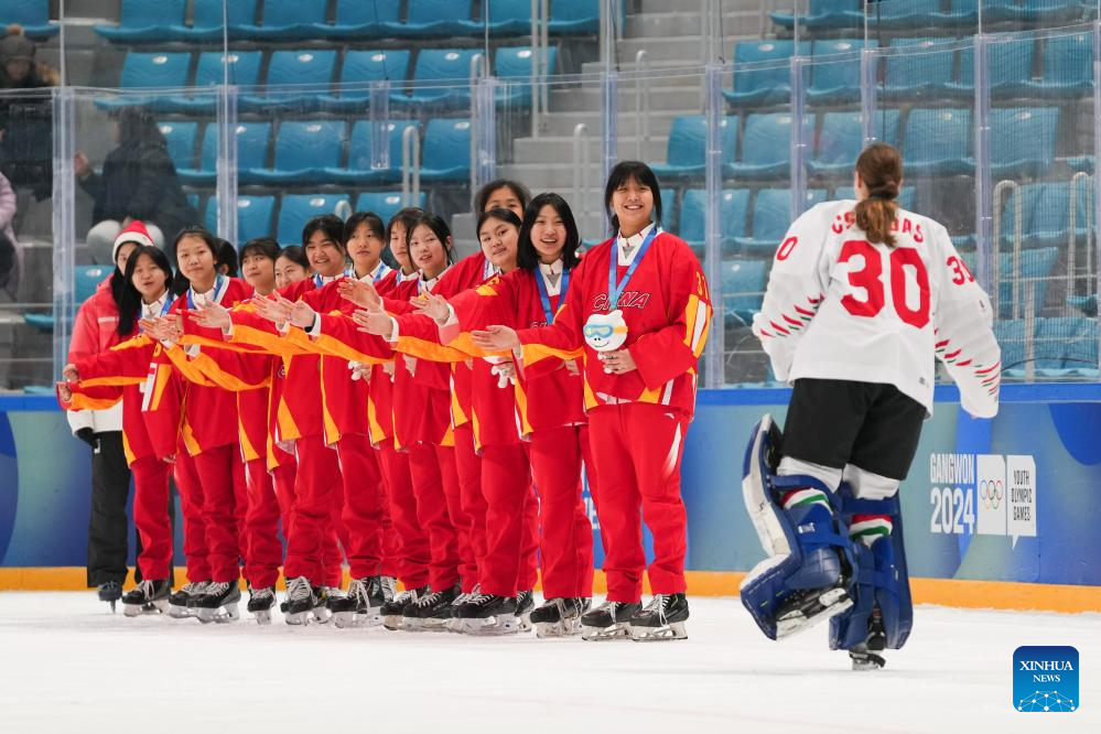 Players of team China congratulate Csenge Csordas of team Hungary during the victory ceremony for the Women's 3-on-3 Tournament of ice hockey event at the Gangwon 2024 Winter Youth Olympic Games in Gangneung, South Korea, Jan. 25, 2024. (Xinhua/Zhang Xiaoyu)