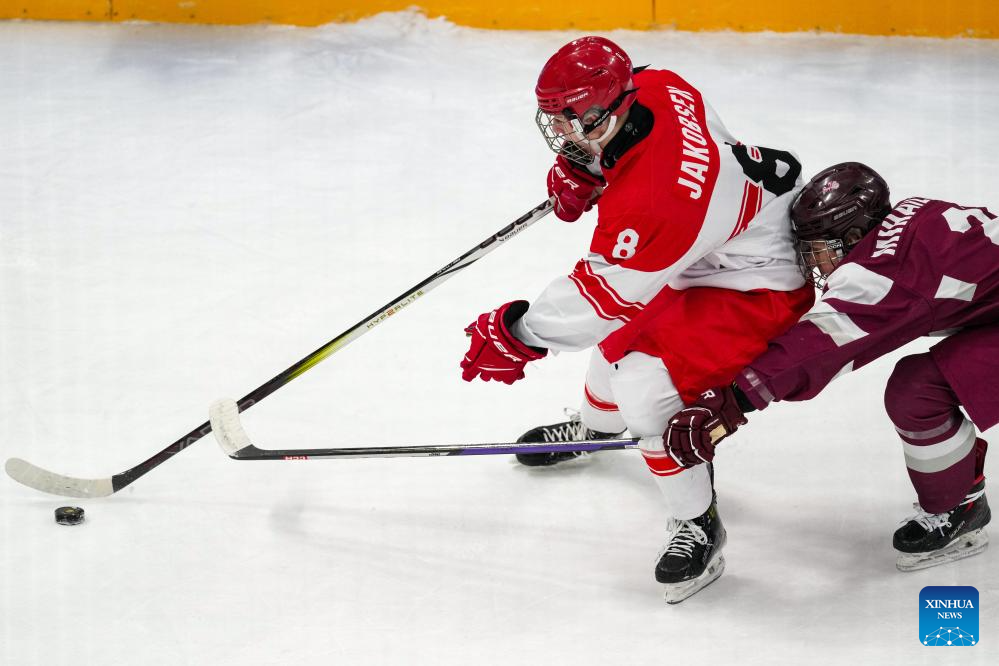 Makss Mihailovs of Latvia (R) and Emil Jakobsen of Denmark compete during the men's 3-on-3 Tournament Gold Medal Game of ice hockey event between Latvia and Denmark at the Gangwon 2024 Winter Youth Olympic Games in Gangneung, South Korea, Jan. 25, 2024. (Xinhua/Zhang Xiaoyu)