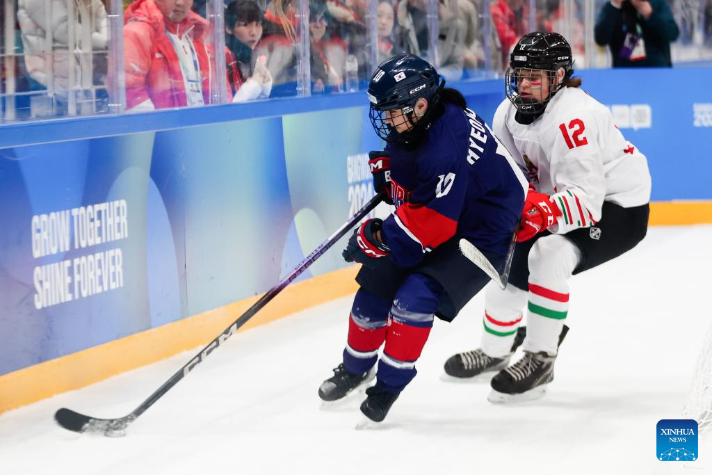 Dora Bereczki (Front) of Hungary competes during the Women's 3-on-3 Tournament Gold Medal Game of ice hockey event between Hungary and South Korea at the Gangwon 2024 Winter Youth Olympic Games in Gangneung, South Korea, Jan. 25, 2024. (Xinhua/Xu Yanan)