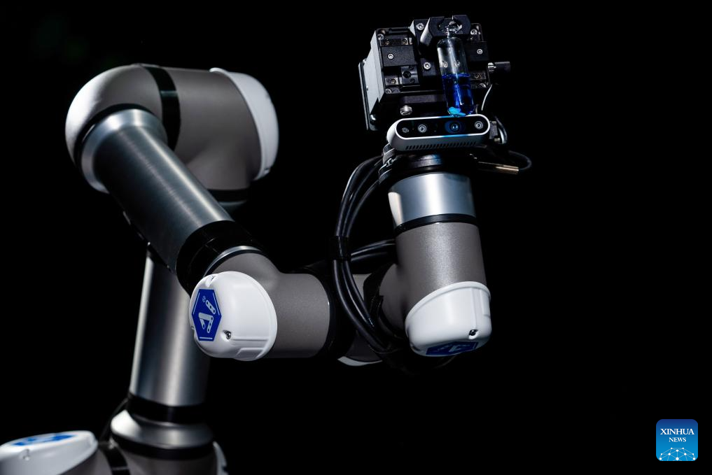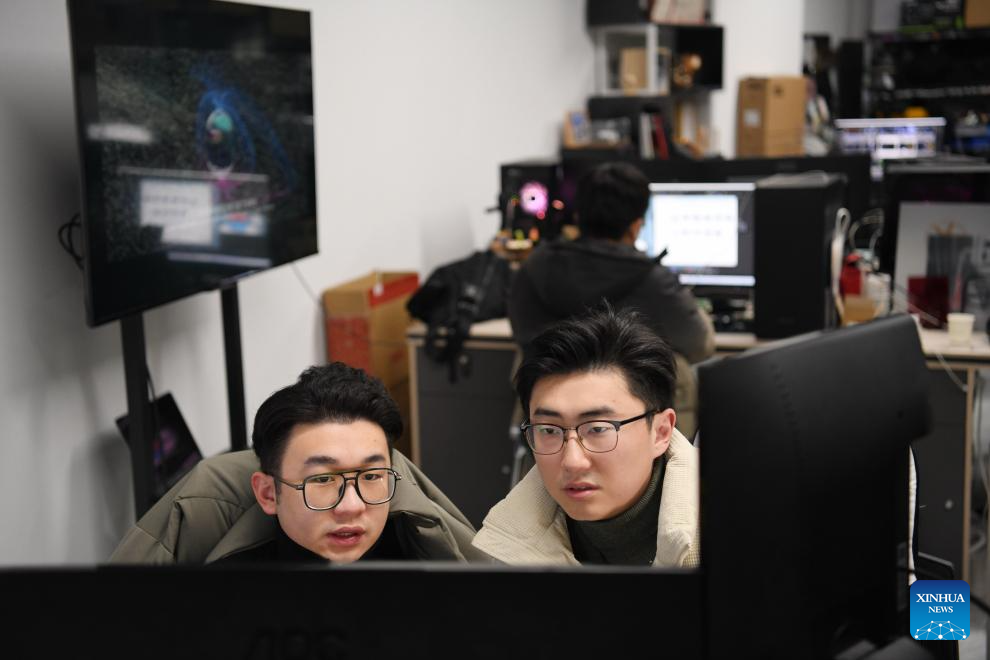Yang Yuanfan communicates with a member of his company in Hefei, east China's Anhui Province, Jan. 18, 2024. (Xinhua/Zhang Duan)