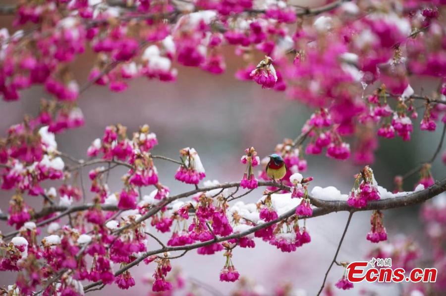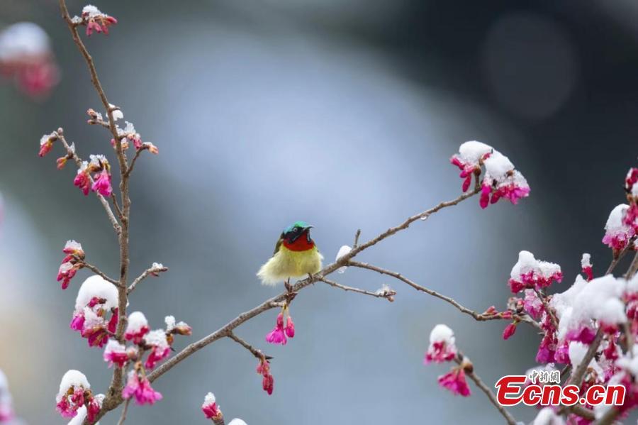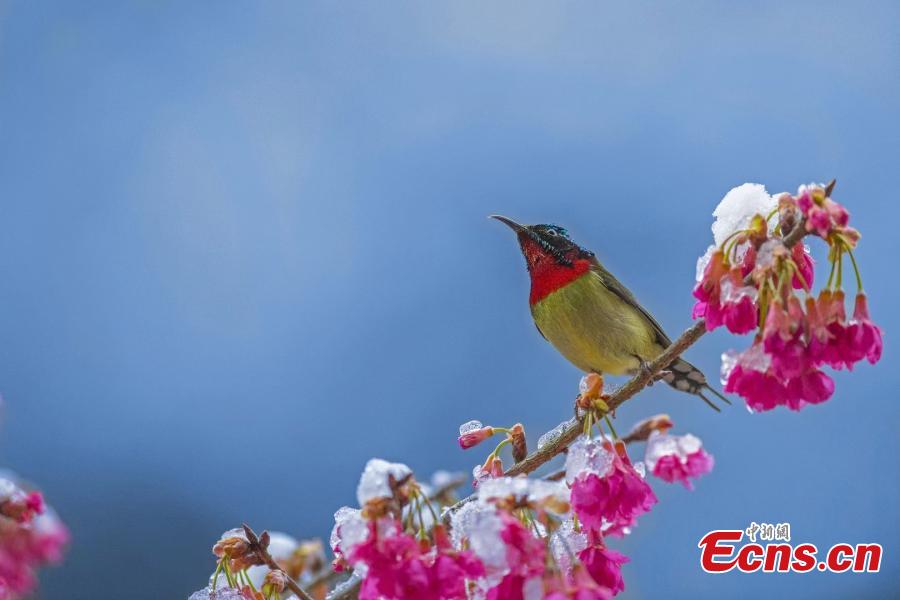 A fork-tailed sunbird is captured perching on tree branch with snow-covered flowers in Sanming, east China's Fujian Province, Jan. 24, 2024. (Photo: China News Service/Zhang Zhenghui)
