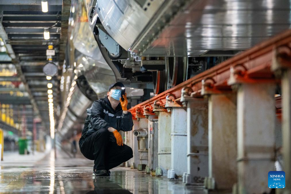 A mechanic checks a bullet train at a maintenance base in Wuhan, central China's Hubei Province, Jan. 25, 2024. (Xinhua/Du Zixuan)