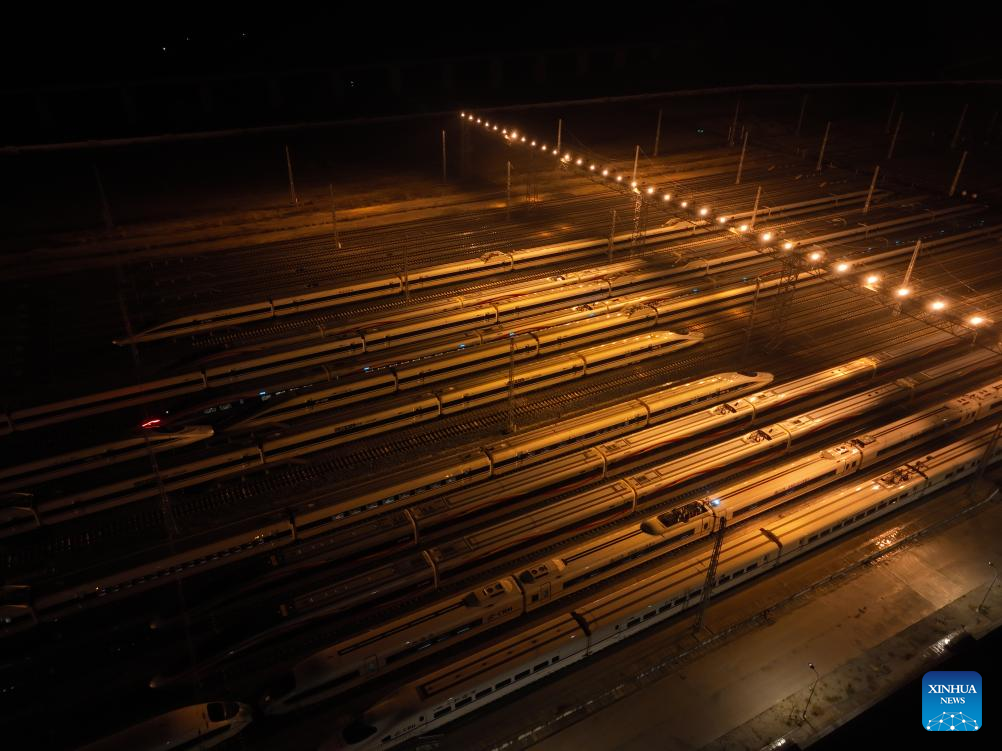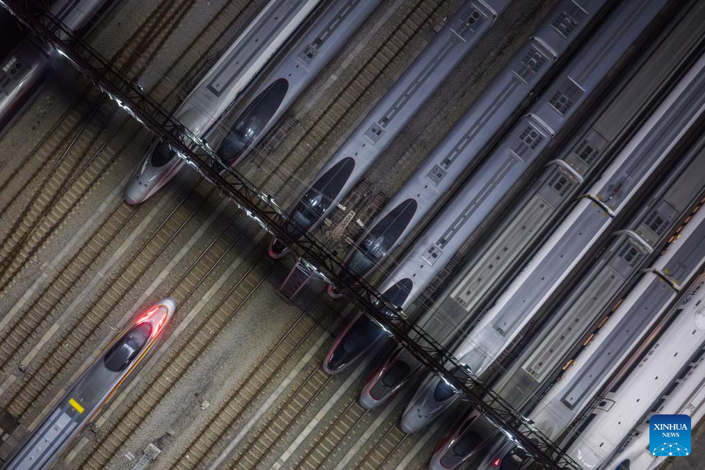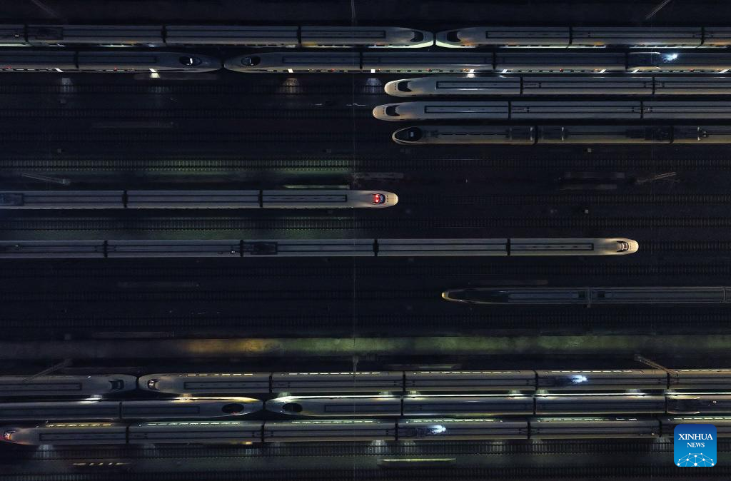 This photo taken on Jan. 26, 2024 shows bullet trains at a maintenance base in Guangzhou, south China's Guangdong Province. (Xinhua/Deng Hua)