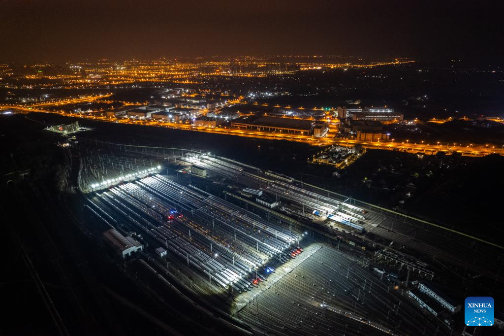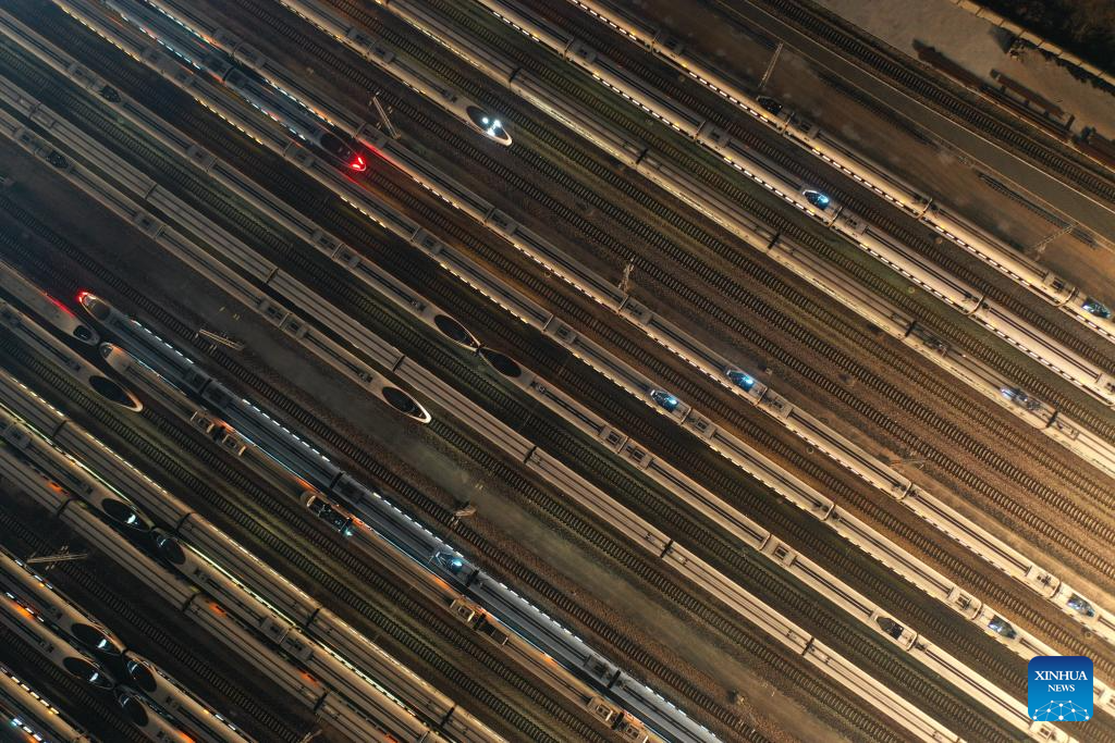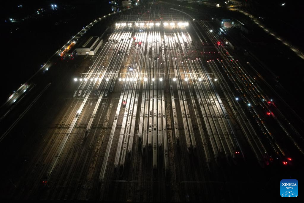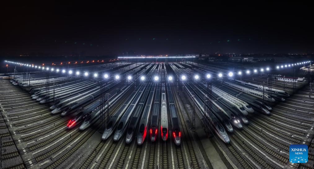 An aerial drone photo taken on Jan. 26, 2024 shows bullet trains at a maintenance base in Nanjing, east China's Jiangsu Province. (Photo by Yang Suping/Xinhua)