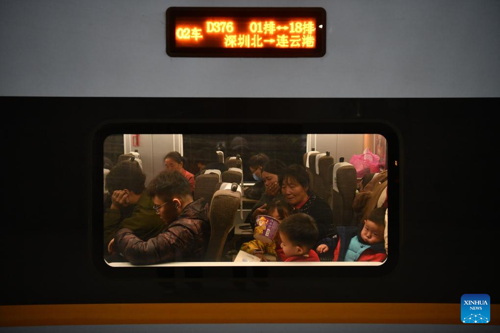 Passengers are seen on a bullet train bound for Lianyungang, east China's Jiangsu Province, at Shenzhen North Railway Station in Shenzhen, south China's Guangdong Province, Jan. 26, 2024. (Xinhua/Liang Xu)