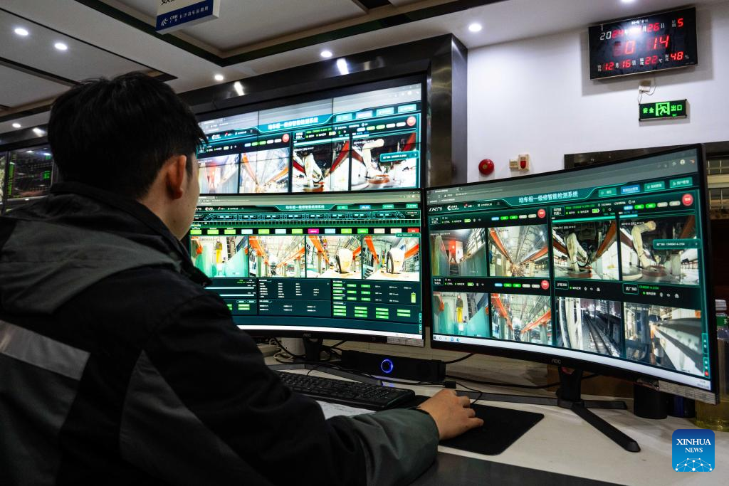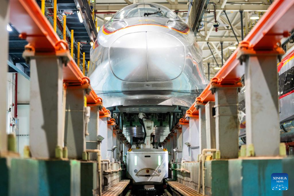 A robot checks a bullet train at a maintenance base in Changsha, central China's Hunan Province, Jan. 25, 2024. (Xinhua/Chen Sihan)