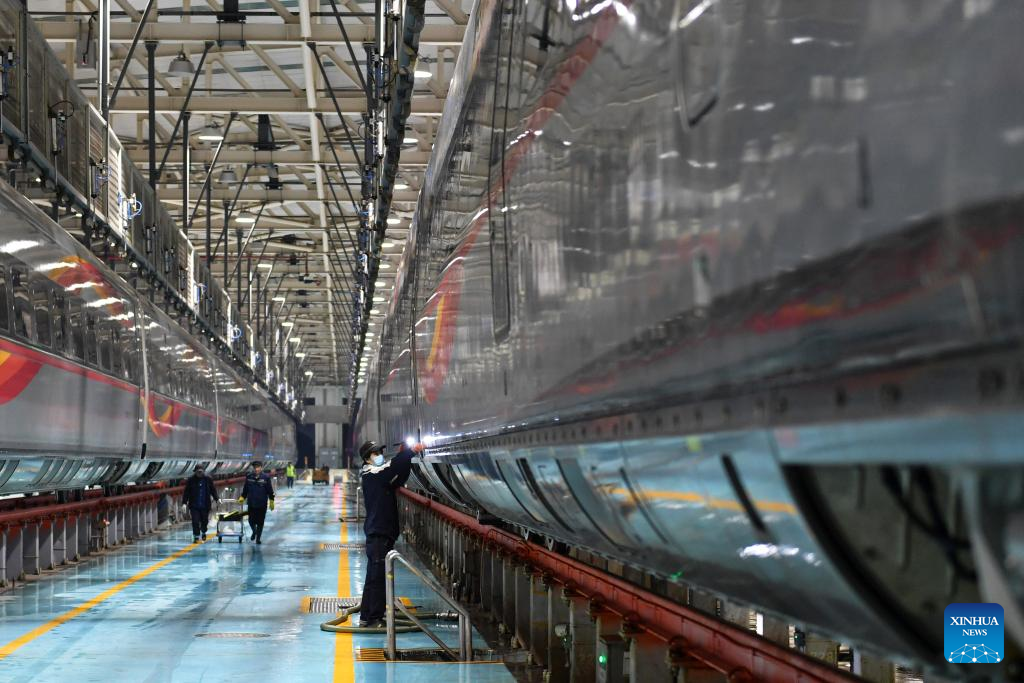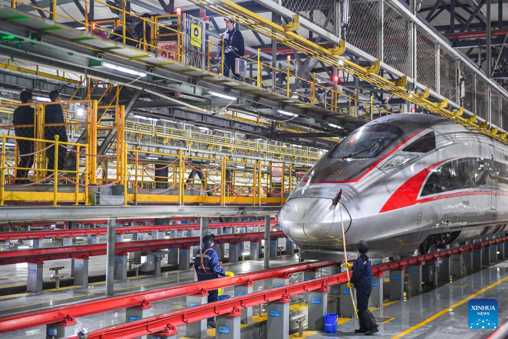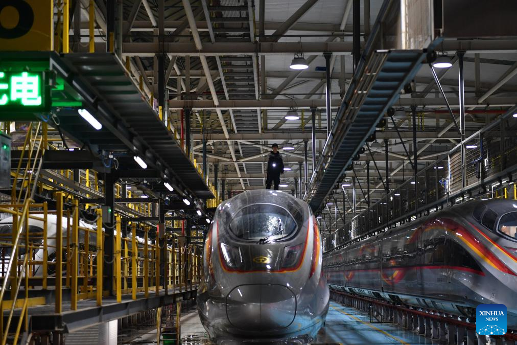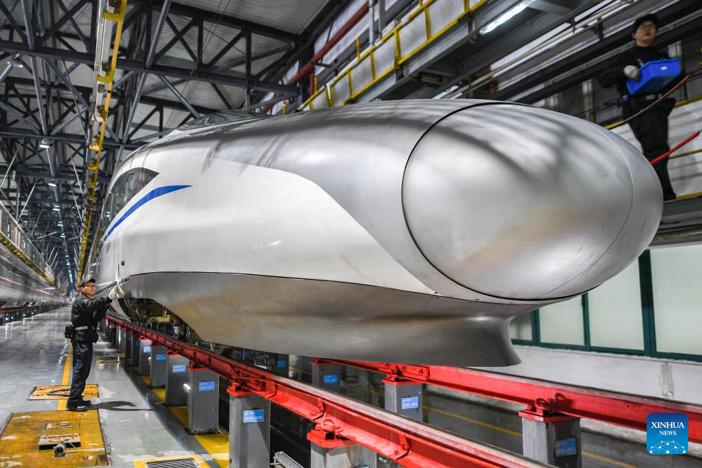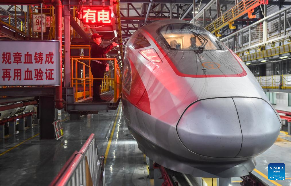 A mechanic checks a bullet train at a maintenance base in Wuhan, central China's Hubei Province, Jan. 26, 2024. (Xinhua/Wu Zhizun)