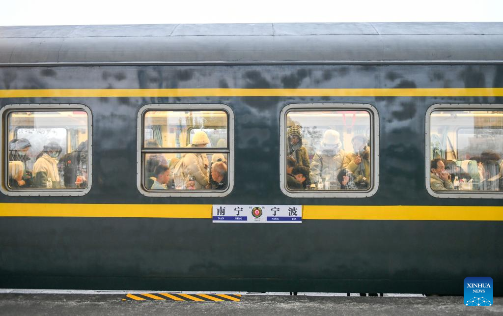 Passengers on board a train wait to depart at Daozhou Railway Station in Yongzhou, central China's Hunan Province, Jan. 26, 2024. (Photo by Jiang Keqing/Xinhua)