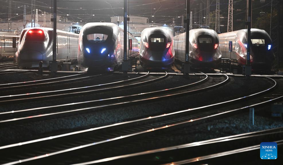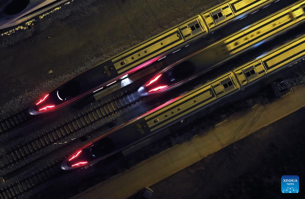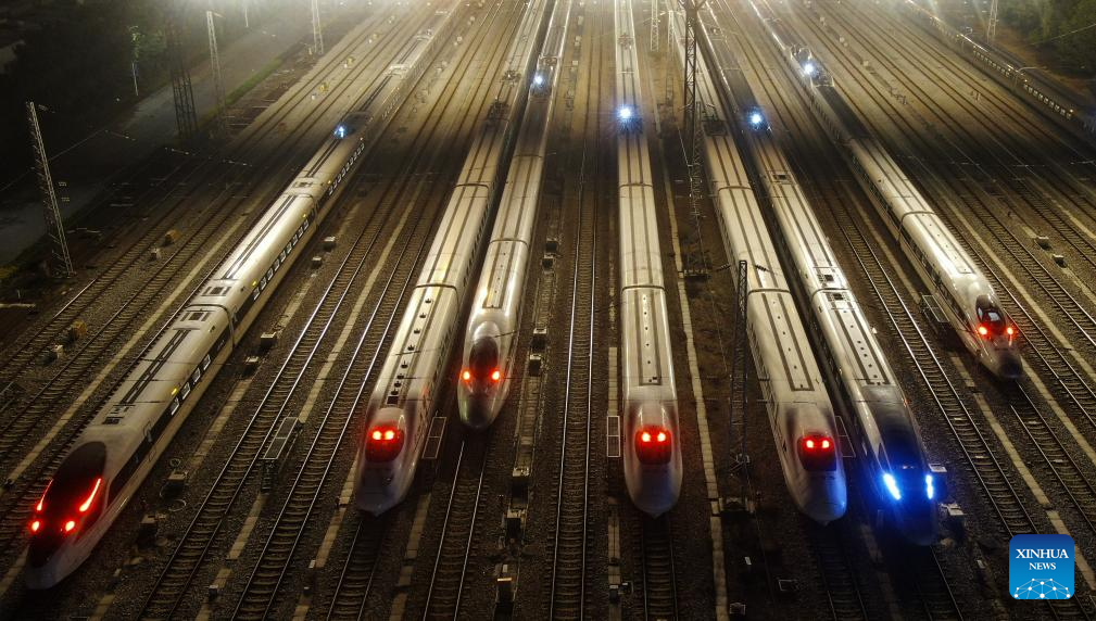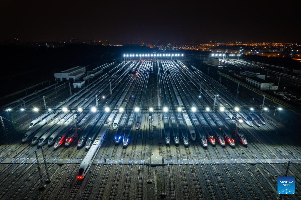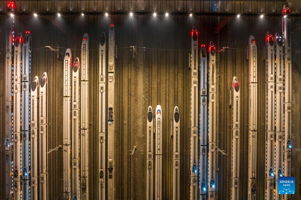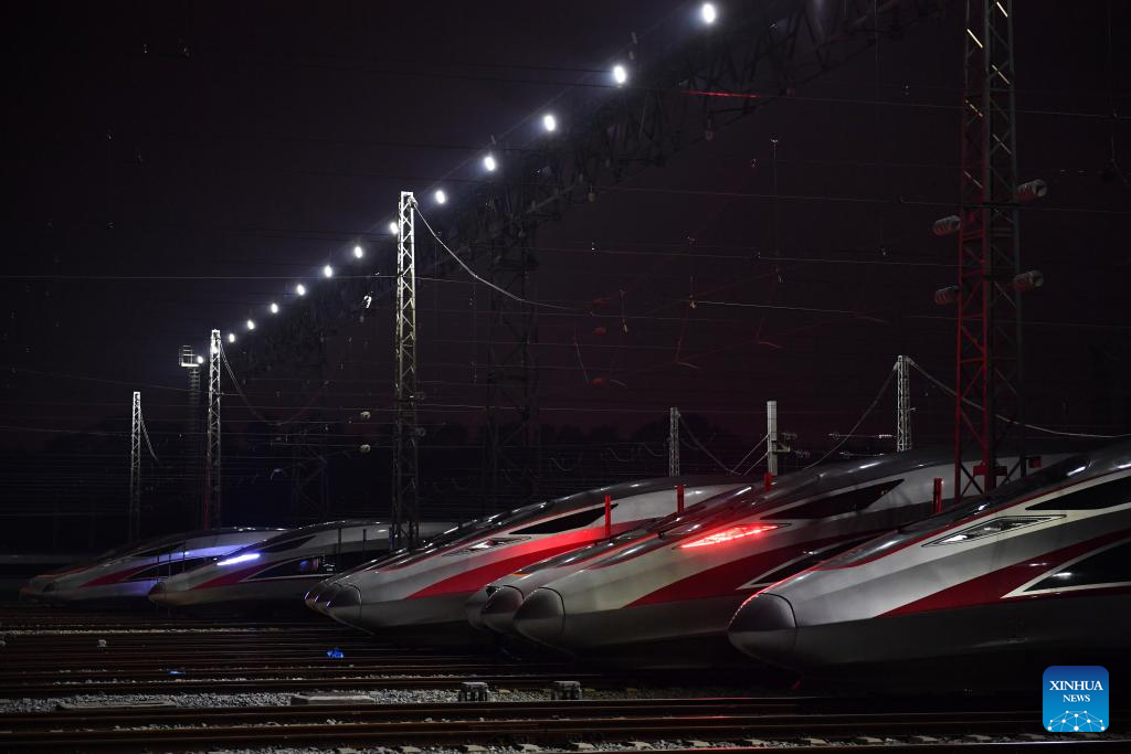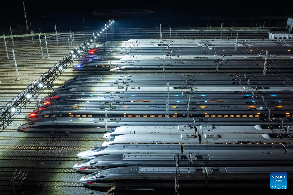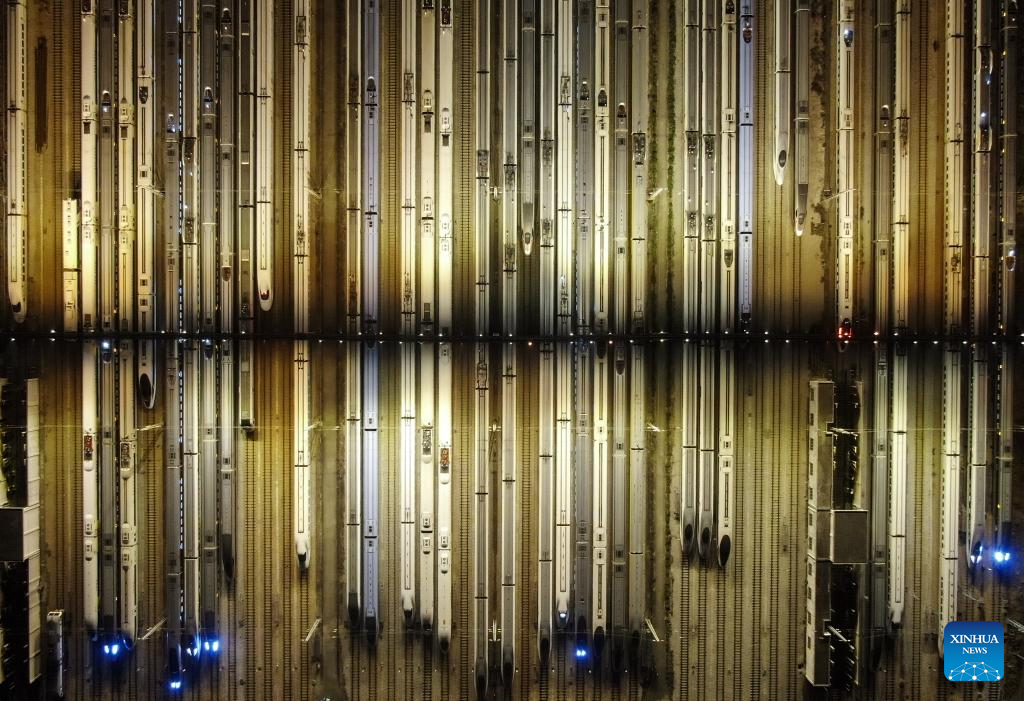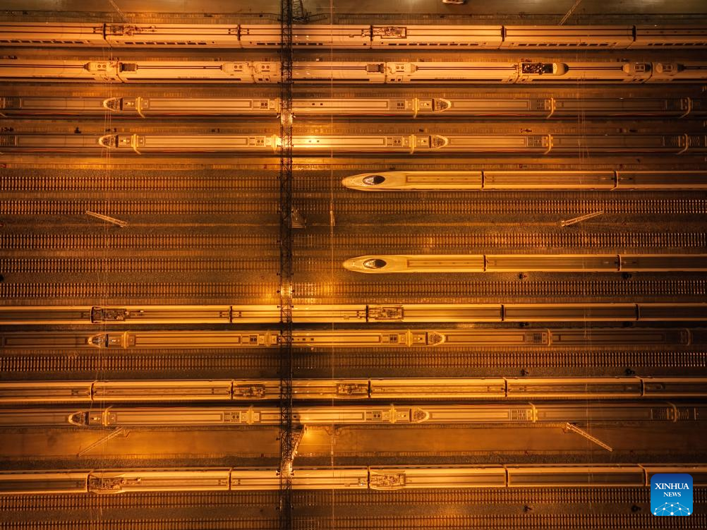 This photo taken on Jan. 26, 2024 shows bullet trains at a maintenance base in Changsha, central China's Hunan Province. (Xinhua/Chen Zhenhai)