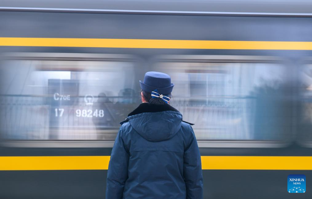 A staff member watches a train depart on the platform at Daozhou Railway Station in Yongzhou, central China's Hunan Province, Jan. 26, 2024. (Photo by Jiang Keqing/Xinhua)