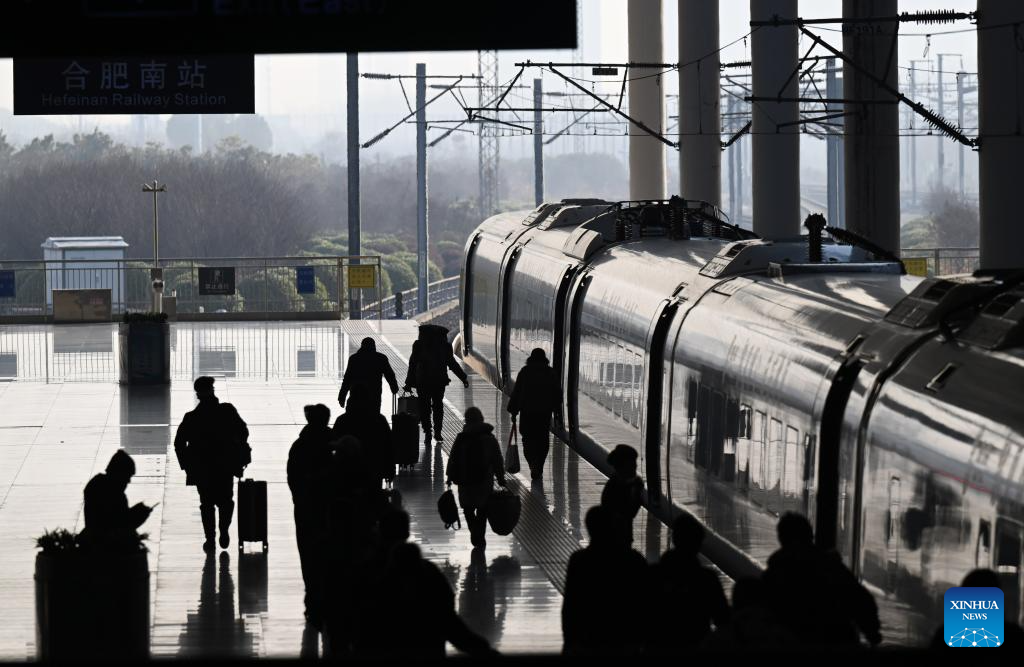 Passengers board a train at Hefei South Railway Station in Hefei, east China's Anhui Province, Jan. 26, 2024. (Xinhua/Zhou Mu)